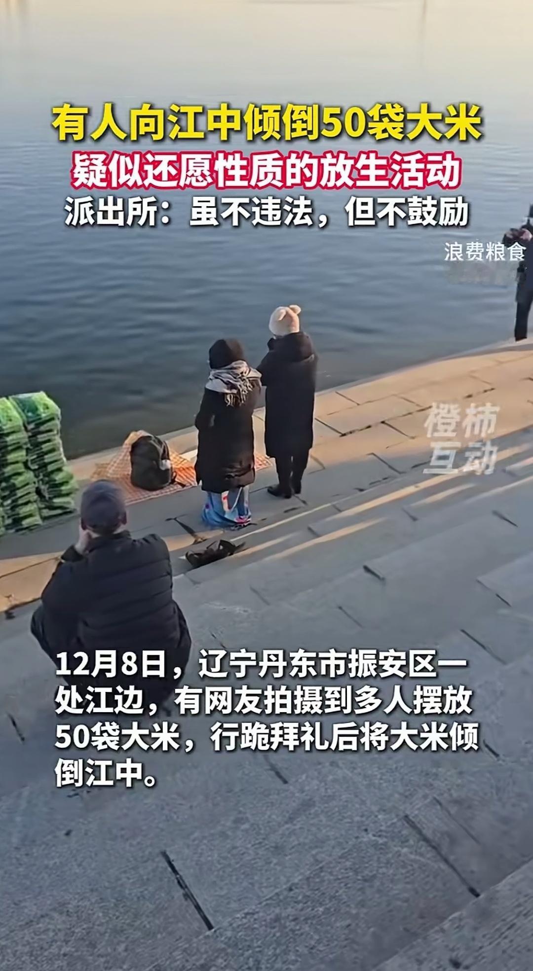 怎么又有往江中倒大米的,还是50袋大米,不知道这粮食来的珍贵吗?就算心中有太多的罪恶,想靠往江中倒大米就能赎罪吗?真要想让自己心安,何不把这些大米送给一些有需要的人,起码还会被人定性为做好事,还会让受助者记住你,有这功德来弥补不好吗? 近日,有网友发视频爆料:12月8日,在辽宁丹东市振安区一处江边,有多人在边上摆了50袋大米后,竟对着江面行跪拜礼,之后把大米倾倒江中,疑似还愿放生。视频画面一曝光,即刻引发网友的热议,热议中说的最多的是,说他们这是罪恶深重,想以这种放生大米来安慰自己;如果真有这份心,何不去帮助有困难的人,放生大米纯粹是浪费! 冬日生活打卡季