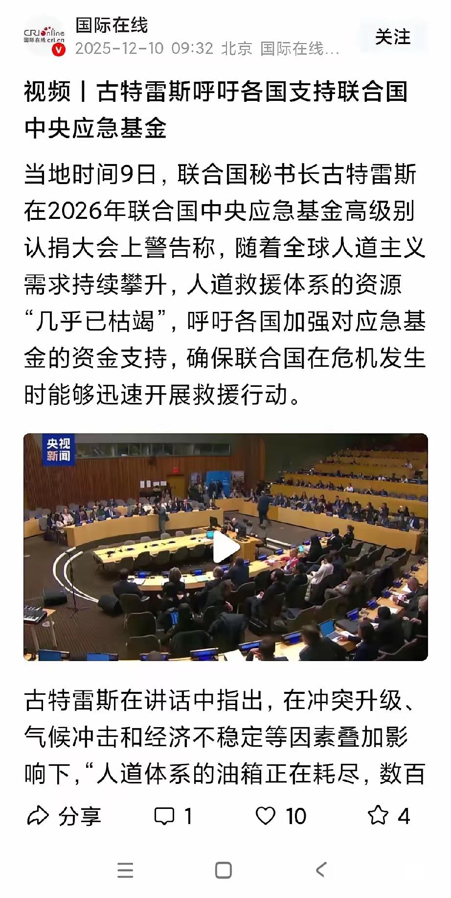 古特雷斯又要应急金了! 想想,我国硬刚日本一个月了,联合国装睡,说实话,这个联合国的眼里只有金钱利益,古特雷斯应该是有史以来最窝囊的秘书长,交了会费,正义却得不到支持,反观不交会费,美国却在联合国横冲直撞。 一边伸手要钱喊穷,一边对国际上的公道事装聋作哑,这波操作属实把双标玩出了新高度。咱们掏着真金白银当会费,在关乎人类共同福祉的大事上据理力争,联合国却揣着明白装糊涂,愣是一句公道话都不肯说。反观美国,常年拖欠会费,欠的钱堆起来能绕着联合国总部转好几圈,却能在安理会指手画脚,想制裁谁就制裁谁,想否决哪项提案就否决哪项提案,活脱脱一副“我是流氓我怕谁”的嘴脸。 古特雷斯这个秘书长当得,说是窝囊都算给面子了。每次遇到大国博弈的硬茬子,不是躲在办公室里发一份不痛不痒的声明,就是满世界化缘要应急金,活像个没牙的老虎,看着威风凛凛,实则连只兔子都镇不住。他心里门儿清,谁是惹得起的,谁是惹不起的,所以只能挑软柿子捏,对那些真正破坏国际秩序的国家,连句重话都不敢说。 更让人寒心的是,联合国本该是维护国际公平正义的最后一道防线,如今却成了某些国家的后花园。有钱有枪的主儿,在这里能把黑的说成白的,把错的说成对的;而那些讲道理、守规矩的国家,只能眼睁睁看着正义被金钱和强权践踏。咱们不是心疼那点会费,是心疼联合国这个曾经象征着人类和平希望的组织,一步步沦为强权政治的附庸。 当一个国际组织失去了公正的底色,当秘书长的职权被大国博弈架空,当会费的多少决定了话语权的大小,这样的联合国,还有多少存在的意义?古特雷斯想要应急金没问题,但他得先搞清楚,应急金救的是联合国的急,救不了这个组织公信力崩塌的命。 各位读者你们怎么看?欢迎在评论区讨论。 中国联合国 联合国秘书长古特雷斯