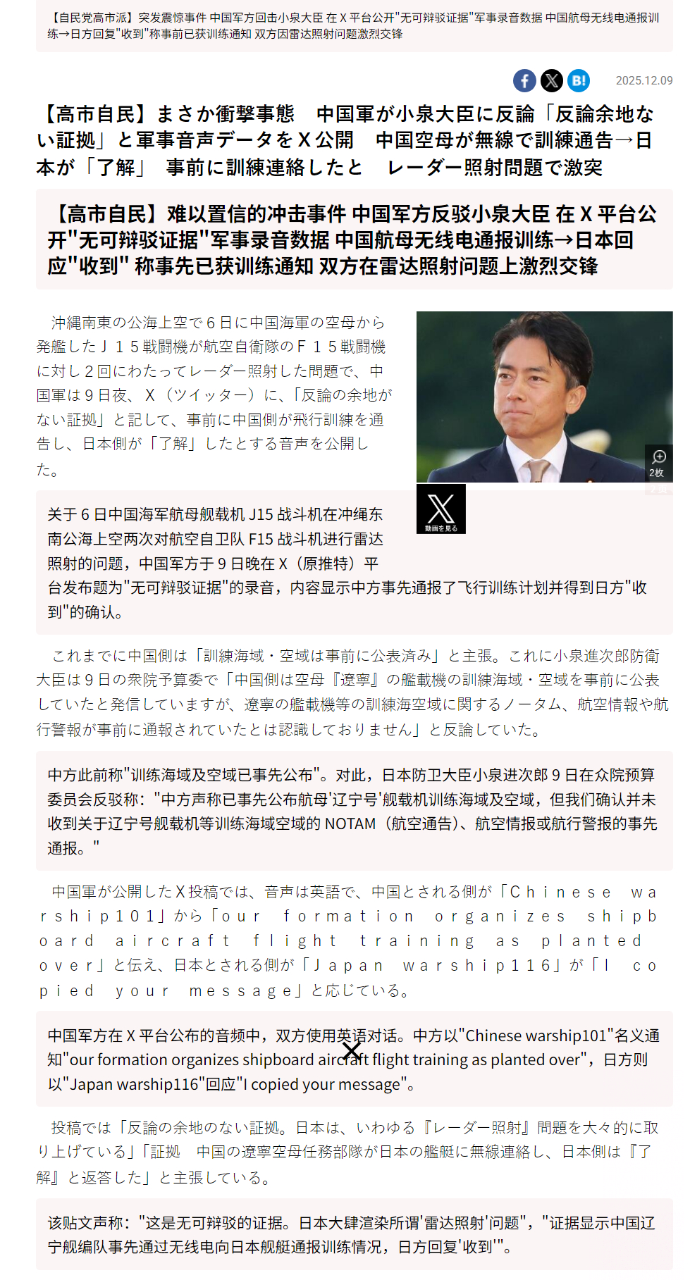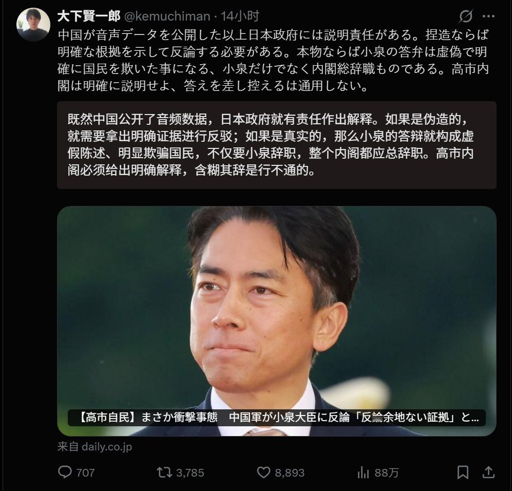 🔻关于小泉之前说没通报被打脸这事,也有日本人在喊“小泉进次郎辞职”、“高市早苗内阁总辞职”。🔻当然,这样的日本人是少数中的少数。日本求锤得锤中俄轰炸机和航母从3个方向包围琉球热点现场海外新鲜事