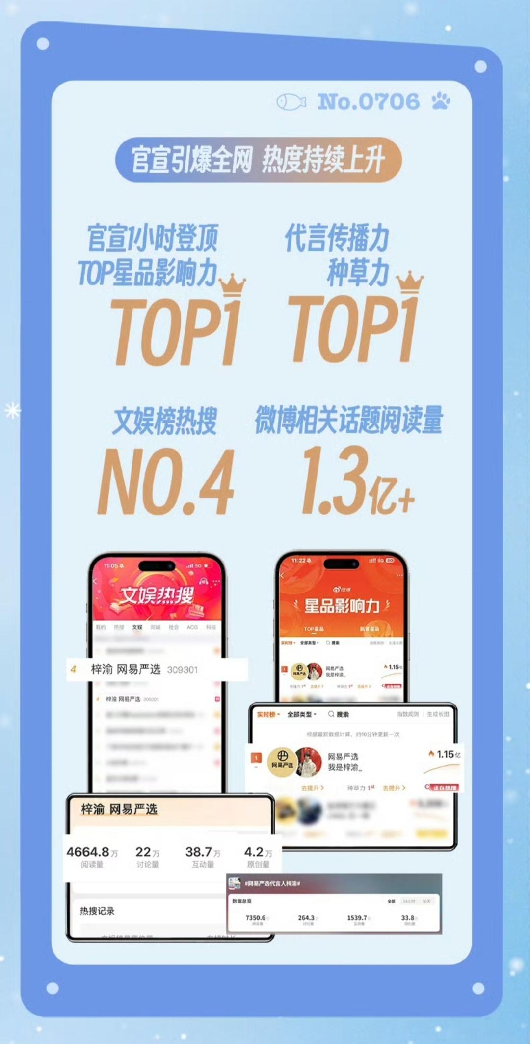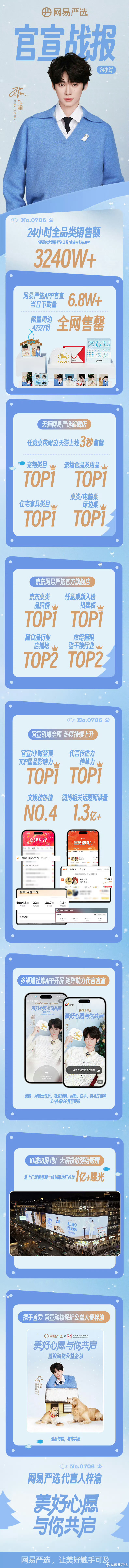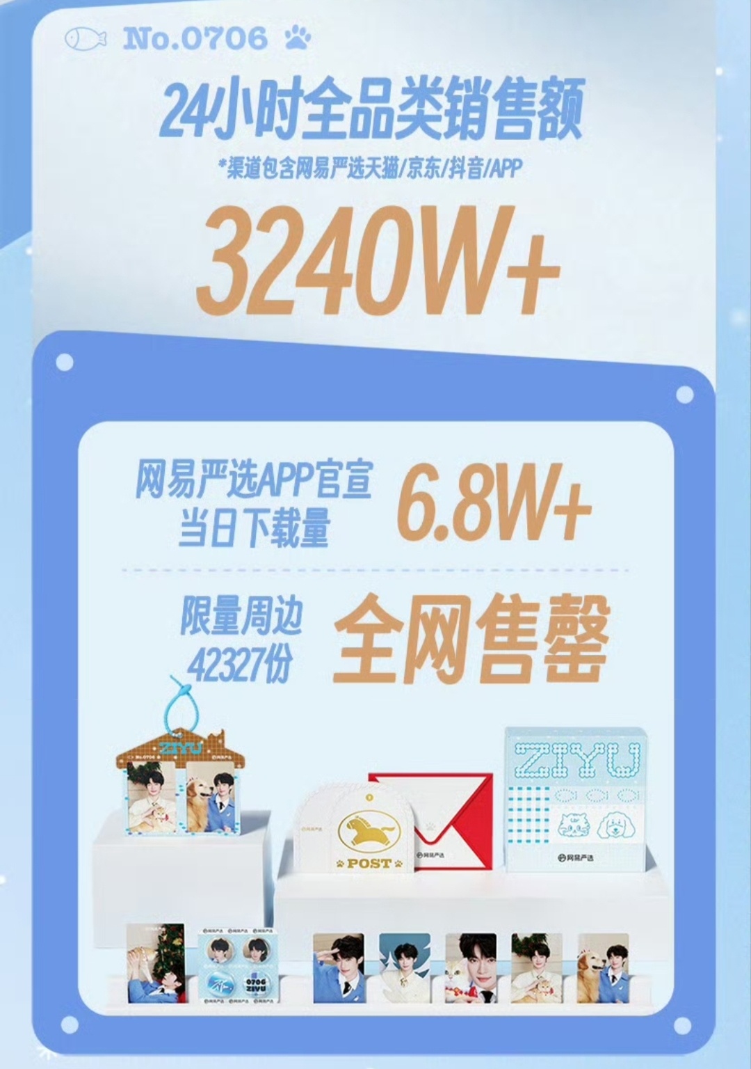梓渝网易严选战报 梓渝✘网易严选官宣战报💥全品类销售额24小时突破3240w+!限量周边42327份全网售罄!天猫任意桌带周边3秒售罄!微博星品影响力TOP1!全国38屏地广大屏投放助力1亿+曝光,10+热门社媒开屏强势吸睛梓渝销售额24小时突破3240w 梓渝微博之夜推荐值破50万