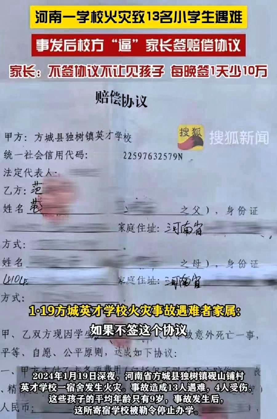 方城火灾赔偿,范啸楠爸爸曾透露,每个学生赔了约130万,拿了钱不能再追究 当初那份赔偿协议,根本不是家长们心甘情愿签的。他们被逼到了绝境——不签,就连孩子最后一面都见不到。 范爸爸直言,那130万赔偿款一分没动,那是孩子用命换来的钱,实在不忍心花。如今,几位家长宁可冒着“违约退钱”的风险,也要把这份逼签协议公之于众,他们要的从来不是钱,而是一个明明白白的说法。 还有守着老屋不肯搬走的范奶奶,嘴里反复念叨着“孩子回家找不到人咋办”,这话听着就让人心里发酸。那些孩子里,不少是爷爷奶奶一手带大的,平日里细心照料、视若珍宝,可一场大火,把所有的念想都烧成了灰烬。 老人的这份执念,藏着最真切的牵挂,失去孩子的痛,不是短时间就能平复的。 这笔赔偿,从来都不是什么安慰,更像是想堵住家长们追问真相的封口费。钱能买来很多东西,却买不回孩子的笑脸,换不回一家人围坐的温暖。 家长们的诉求很简单,就是依法处理相关责任人,排查校园安全的漏洞,让这类悲剧再也不会重演,让逝去的孩子能瞑目。 13条鲜活的小生命,不该就这样悄无声息地被遗忘。校园安全不是一句轻飘飘的口号,它关系着每一个家庭的幸福安稳。别让时间冲淡了伤痛,别让赔偿掩盖了真相,更别让那些无辜的孩子白走这一遭。