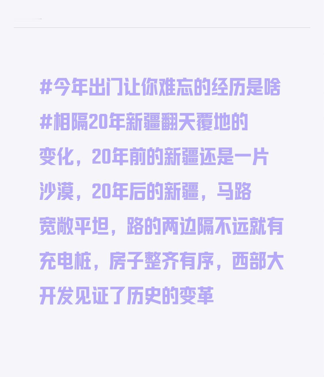 今年出门最难忘的就是去了新疆,这一趟让我见识到相隔20年新疆的巨变。20年前新疆还有大片沙漠,可如今完全不一样了。 走在新疆的马路上,又宽又平坦,开车超舒服。而且每隔不远,路边就有充电桩,对于开新能源车的人来说太友好了。再瞧瞧那些房子,整齐有序地排列着,充满了现代生活的气息。西部大开发真是功不可没,它就像一支神奇的画笔,描绘出了新疆如今的繁荣景象,这历史变革让人打心底里感到震撼。