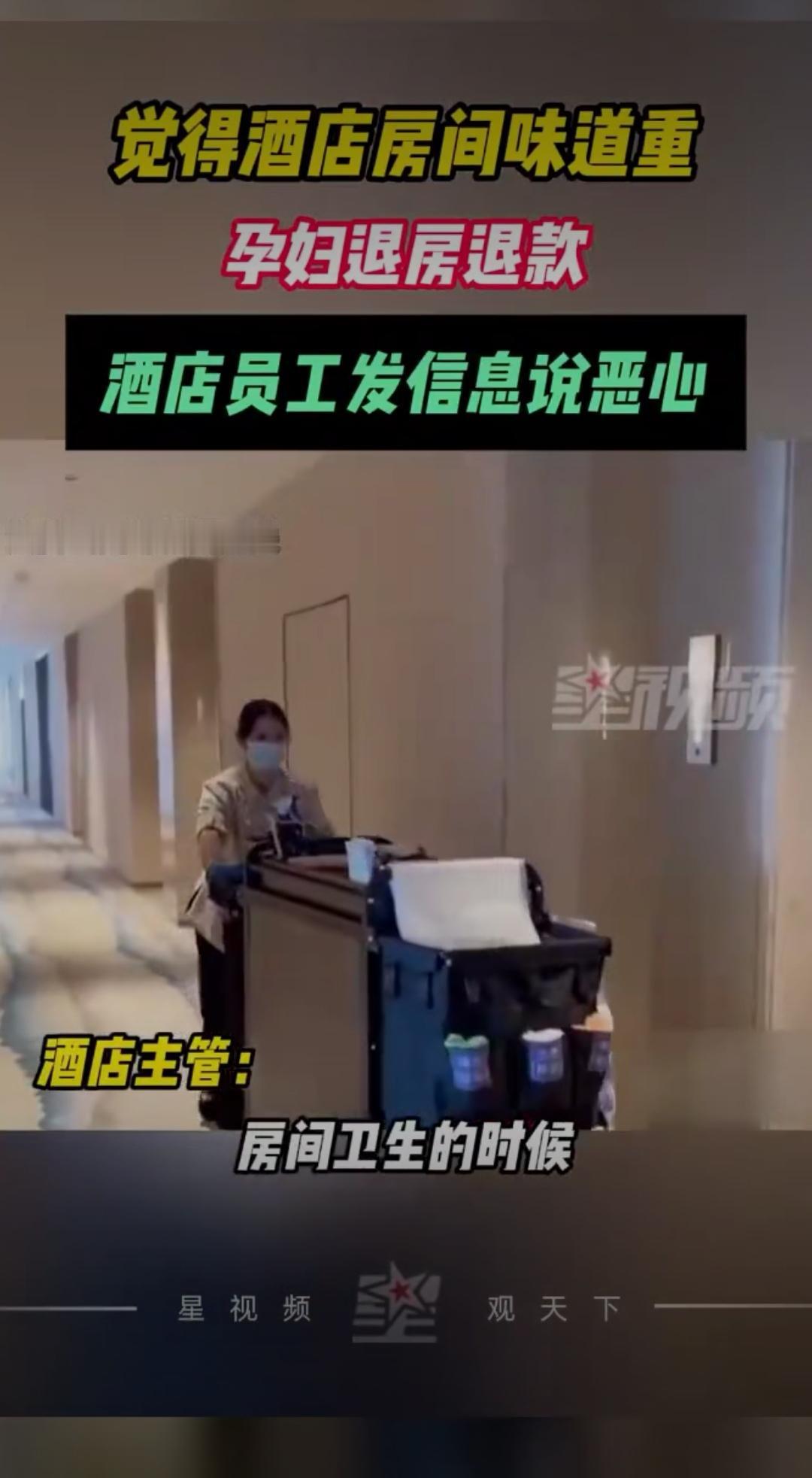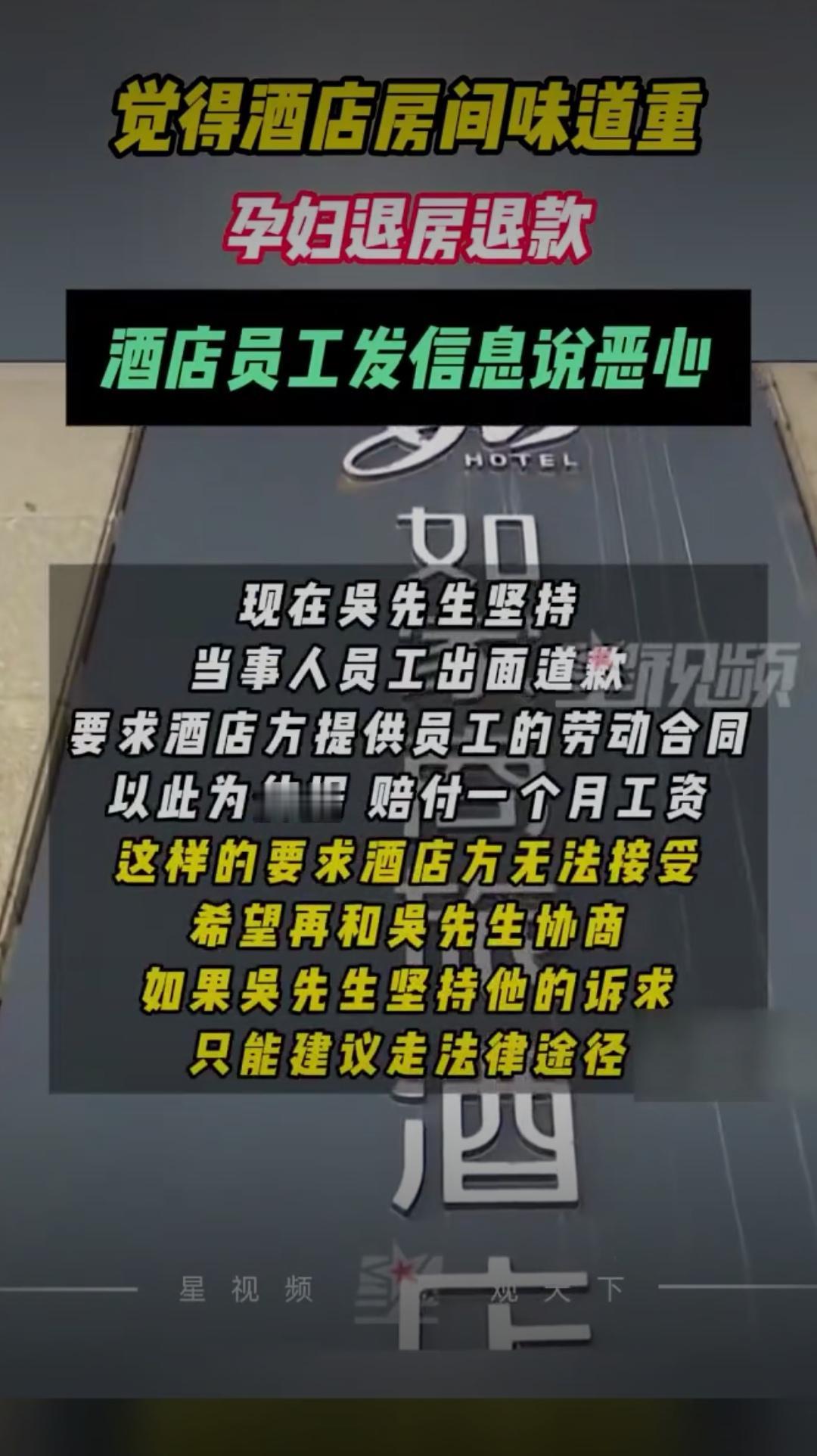 孕妇嫌酒店味重退房退款,却收到员工“恶心”辱骂短信!事件反转后网友吵翻了酒店退订维权 觉得酒店房间味道重,临产孕妇果断退房退款,本是合理维权,没想到转头就收到酒店员工的辱骂短信,一句“真让人恶心”像根刺扎进心里。这起发生在杭州的纠纷,从“孕妇被欺负”的共情,到剧情反转后的争议,戳中了太多人对“信任”与“边界”的敏感神经。 事情的来龙去脉比想象中更复杂。吴先生为方便临产妻子就医,深夜入住如家商旅酒店,却发现房间甲醛味重还无窗户,担心影响胎儿便申请退房。前台小姑娘出于对孕妇的照顾,没多核实就全额退款,只随口问了句“房间动没动”,得到“没动”的答复后便放行。可保洁查房时却发现,房间里留着外卖垃圾,床单被坐得凌乱,床品必须全部更换,这意味着酒店要承担额外成本,小姑娘觉得自己的信任被辜负,一气之下发了那条满是指责的短信,甚至嘲讽对方“穷得活不起”“没素质”。 一边是即将临产的孕妇,本就处于脆弱阶段,却遭言语攻击,换谁都难以接受;另一边是刚入社会的前台,出于善意信任却被“欺骗”,冲动之下口不择言,最终落得被辞退的下场。酒店后续给出2500元赔偿达成和解,但舆论却彻底分裂:有人心疼孕妇,认为服务行业再委屈也不能辱骂顾客,更何况是特殊群体;更多网友却共情前台,觉得“撒谎在先”的消费者才该反思,“说没动房间却留下垃圾”的行为,本身就是对他人信任的消耗,小姑娘不过是为自己的善意买单。 这起纠纷的核心,从来不是“谁对谁错”那么简单。它暴露了人性里的双重困境:消费者渴望被真诚对待,却有人为了图方便透支信任;服务从业者期待被理解,却容易在情绪上头时突破职业底线。酒店房间是否真的甲醛超标、未提前告知无窗是否侵犯知情权、退房流程是否规范,这些问题都值得追问,但更让人唏嘘的是:本该互相体谅的关系,怎么就变成了“互相伤害”? 信任是人与人之间最脆弱也最珍贵的东西,一句谎言、一次冲动,就能轻易击碎。你觉得孕妇和前台谁更委屈?如果是你遇到这种情况,会怎么处理?欢迎在评论区说出你的看法~