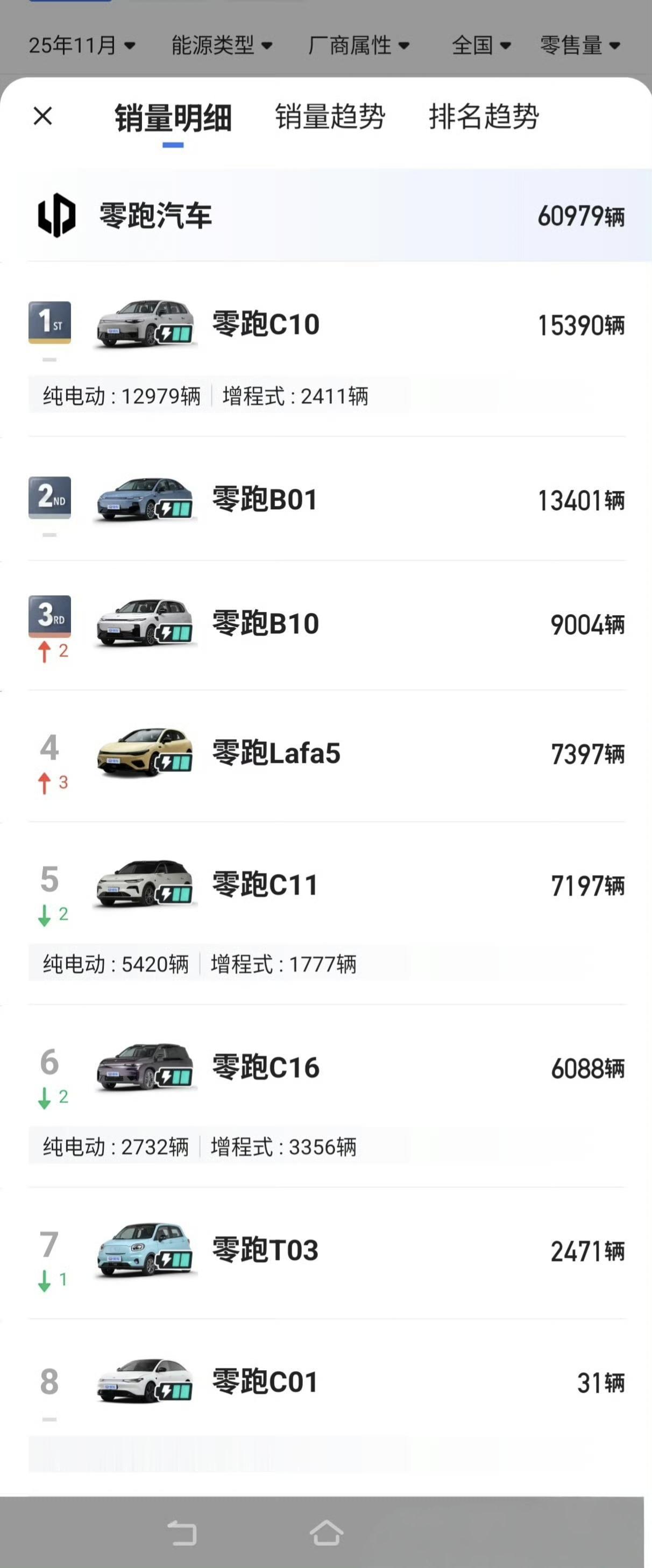 零跑C10,卖的太好了,连续7个月新势力中型SUV销冠。 零跑的11月销量组成,这个销量结构太健康了,除了最后那两款车,基本上每一款都还不错, C10是卖的最好的,刚上市的lafa5都能够卖这么多,可以期待一下马上要到来的零跑D19和A10。 ​​​【来自懂车帝车友圈】