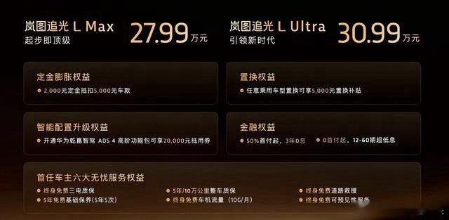 🎉岚图追光L今日正式上市!27.99万起享华为黑科技+满配福利,中大型车新选择来啦两款配置车型售价27.99万(Max)、30.99万(Ultra),搭全域800伏岚海智混技术+1.5T插混动力,CLTC纯电续航410km,5C超充12分钟就能从20%充至80%,通勤长途都省心。华为乾崑ADS4辅助驾驶+鸿蒙座舱5双加持,配置拉满还配多样豪华装备,颜值与实力兼具专属权益超给力:2000元定金抵5000元车款,任意车型置换享5000元补贴,还有3年0息/超低息金融方案,首任车主享终身免费三电质保等六大无忧服务!岚图追光L正式上市中大型新能源轿车推荐