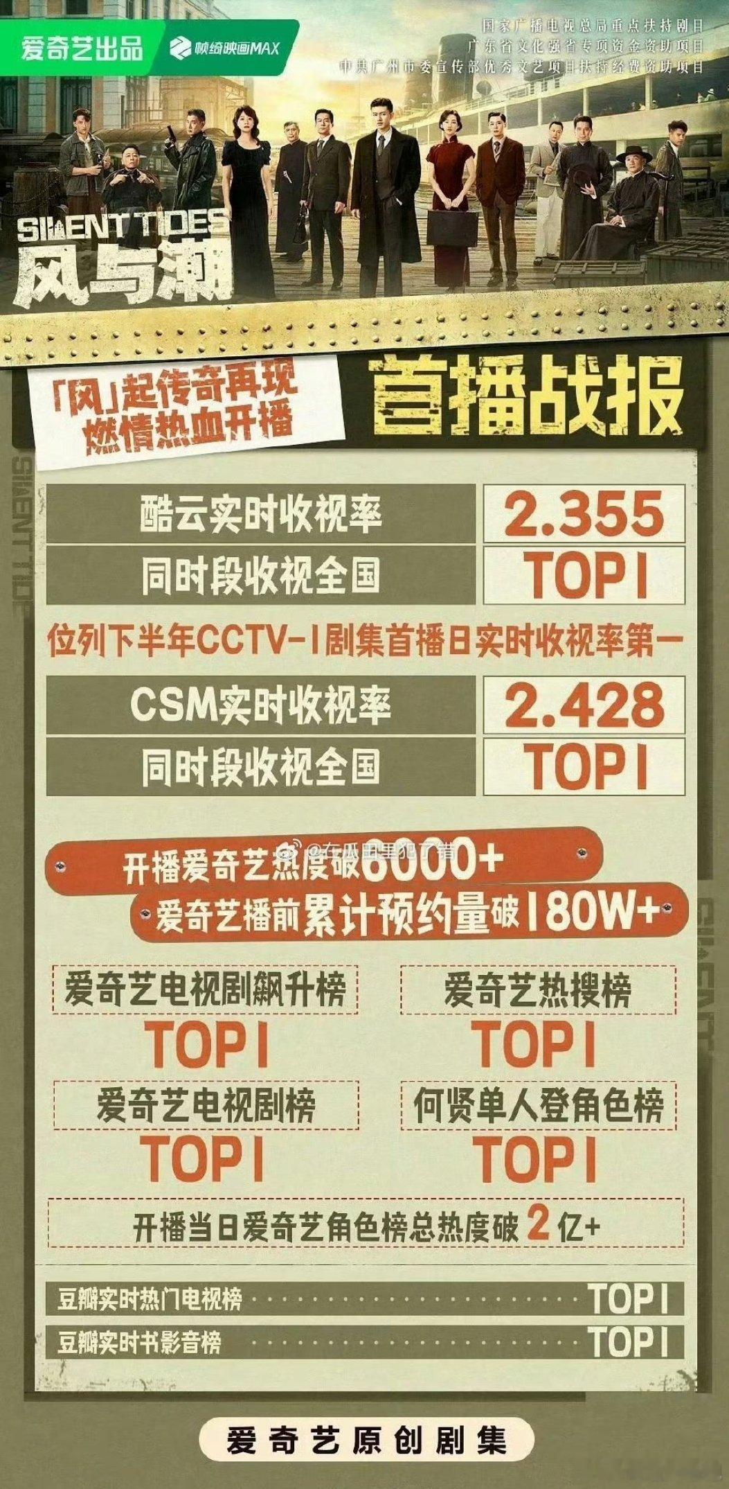 任嘉伦《风与潮》CVB首播破3.1,拿下央1下半年第一!风与潮全肯定,任嘉伦全肯定!太厉害啦!