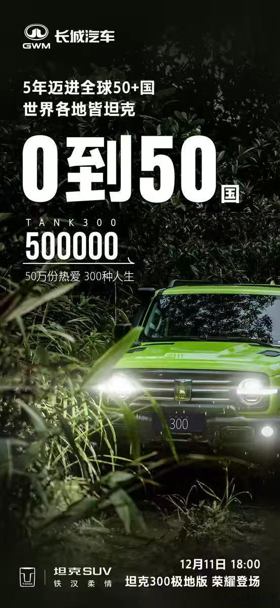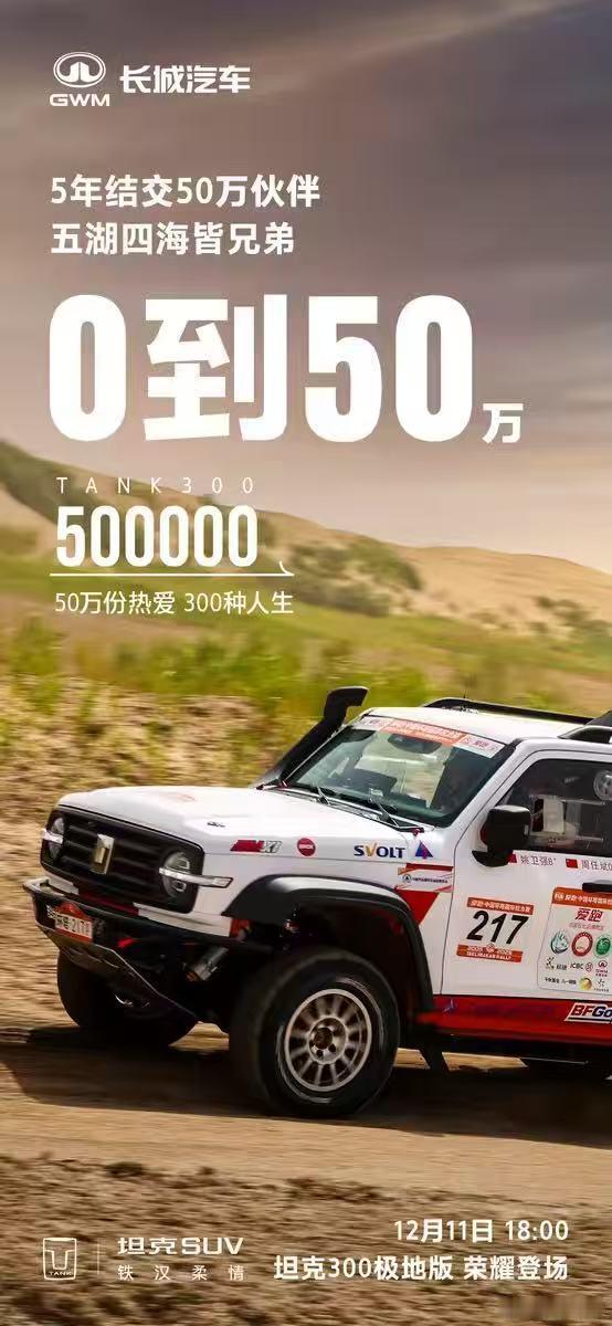 5年50个国度14个版本172亿里程数字见证 50万热爱 300种人生12月11日 18:00 坦克300极地版 荣耀登场!坦克300中国越野极地荣耀买一台车交一群朋友从长城车到长城站