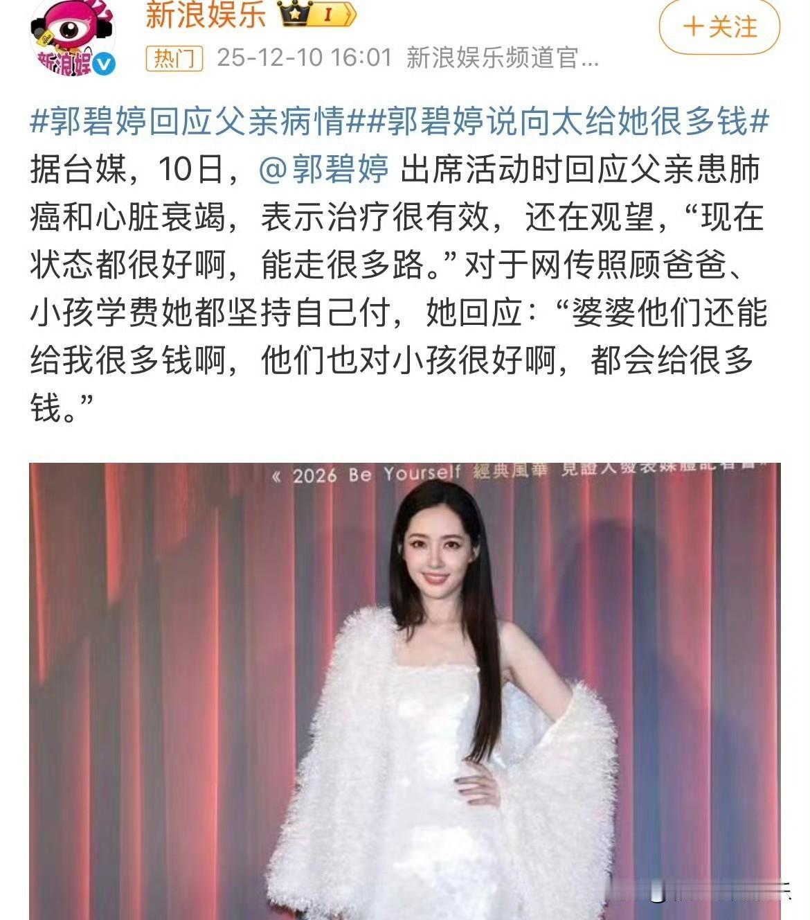 郭碧婷低头了,说向太给她很多钱,他们对孩子也很好,还说婆婆不反对她住在台北。 郭碧婷爸爸心疼女儿工作带娃照顾爸爸,她还要照顾几百只收养的流浪动物,真是太累了。 郭碧婷三观很正,婚后婆婆给她买了地买了豪宅还送了珠宝,付出了许多,甚至把她和孩子当继承人。 这是一场双向奔赴的婆媳感情,即使向佐郭碧婷长期分居,也不会影响夫妻感情,分工不同而已。