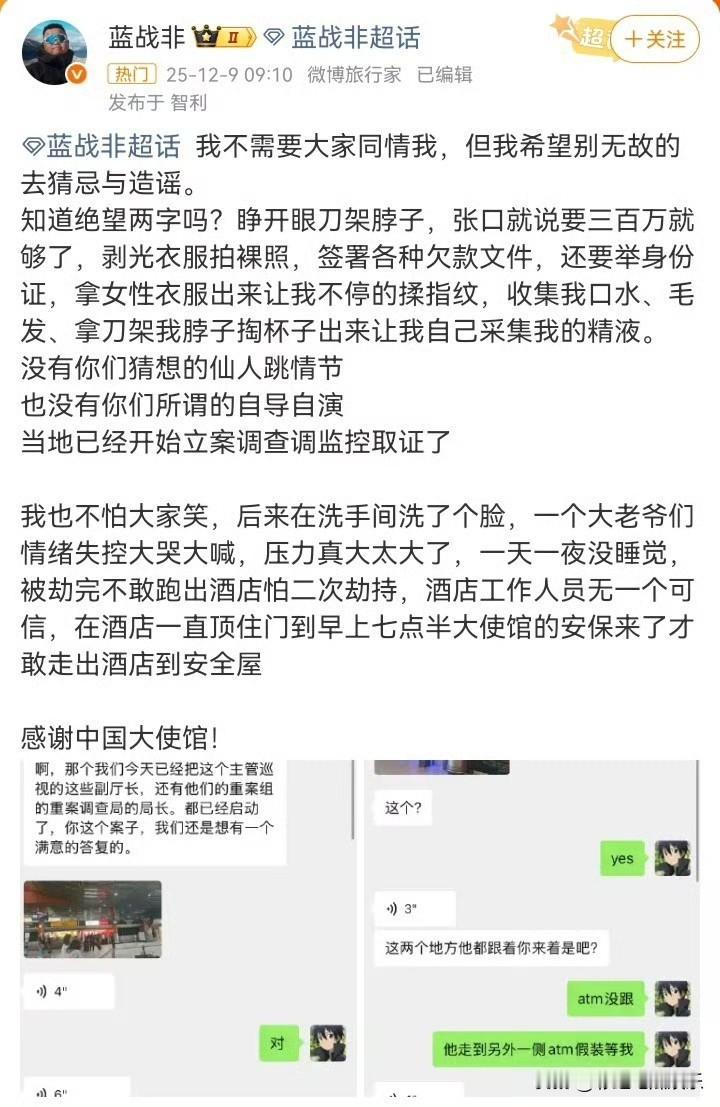我国大使馆回应蓝战非被迫转账计108.8万元人民币,原来是国人抢走的,老乡见老乡背后开一枪,实在太狠了。 蓝战非之所以选择报警不担心对方报复,是因为他被迫扒了衣服录了视频还收集了DNA,要忍受长期被威胁的风险。 蓝战非权衡利弊之后,决定报警相信警方,既然是国人他总会留下蛛丝马迹,那就杀鸡儆猴吧,不能让坏人逍遥法外!