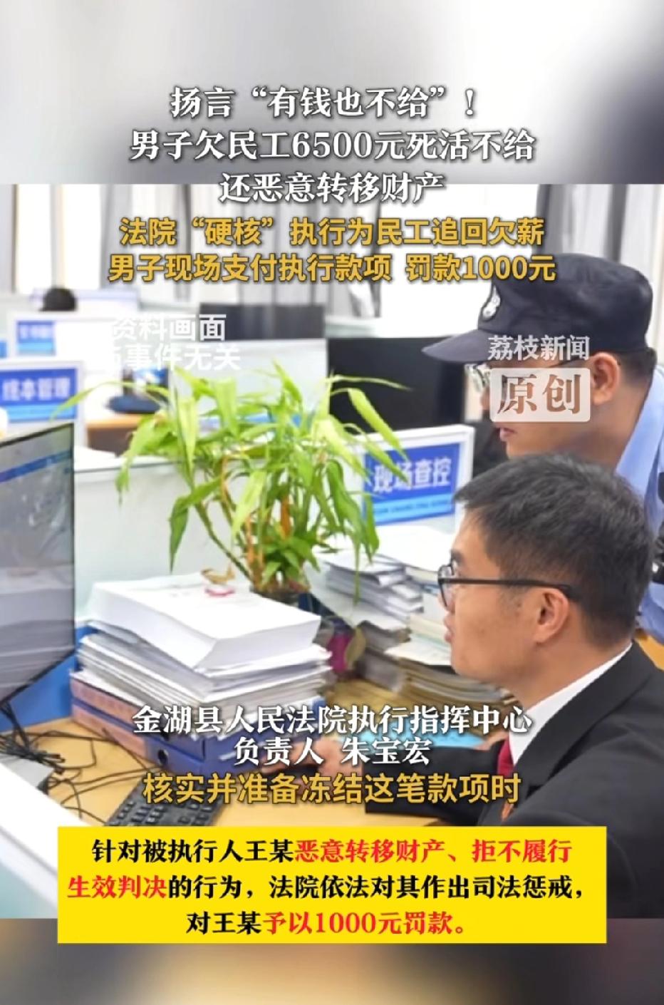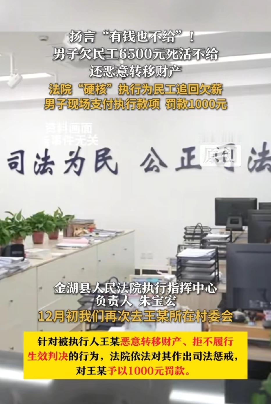 江苏淮安,男子找民工来安装水电,他跟对方谈好价格6500元,约定按期结账。不料,约定时间到了,男子却翻脸不给,直言没钱。民工将男子告上法院。法院判决男子限期支付,男子却表示,有钱也不给,还恶意转移财产。法院最后的判决,让男子慌了。 男子王某因家中要安装水电,他多次对比价格,发现市场上费用太高了,报价动辄上万,这让本就想省钱的王某肉疼不已。 经过打听,他了解到葛某是做水电项目的,为人厚实,价格实惠。 王某赶紧联系上葛某上门来安装水电。 两人围着老宅转了一圈,葛某根据线路改造、水管铺设的工程量,报出了6500元的价格。 王某当场拍板:就按这个价来!你放心干,活儿干完验收合格,2025年4月10号前,我一分不少结给你。 葛某看着雇主王某爽快的样子,也很高兴,他们干完活,有些老板能按时付清的很少。一般都会缓一些日子才结清。没想到王某如此痛快。 葛某是个实在人,接下活儿后,每天天不亮就骑着电动三轮车赶过来,扛着工具爬上爬下。 开槽、布线、装开关、接水管,每一道工序都做得一丝不苟。 王某也经常来现场转悠,一会儿指着墙角说这里水管要走暗线,一会儿又叮嘱插座多装两个,以后方便用。 葛某都一一按他的要求调整,从没半句怨言。 半个多月后,水电工程顺利完工。 王某当场验收,摸了摸崭新的开关面板,看着通畅的水管,满意地拍了拍葛某的肩膀说,老葛,活儿干得漂亮!钱的事儿你放心,到日子我准打给你。 葛某憨厚地笑了笑,收拾好工具就回了家,心里踏实等着结账。 殊不知,他眼中的“爽快老板”,早已在心里打起了赖账的小算盘。承诺有多诚恳,日后的翻脸就有多难看。 约定的日子到了,王某那边却毫无动静。葛某想着可能是对方忙忘了,主动打了个电话过去。 谁料王某语气冷淡,最近手头紧,没钱,再等等吧。 葛某信以为真,这一等又是半个月。 葛某再打电话,王某要么不接,要么直接挂断。 葛某急了,跑到王某家里去要,王某却当场翻脸,两手一摊:我就是没钱,你能把我怎么样? 辛辛苦苦干了大半个月,换来的却是一句“没钱”,葛某又气又急。 当初对方说得比唱的好听,谁知却是个无赖。 无奈之下,他只能一纸诉状将王某告上了法院。 法院审理后认为,双方虽未签订书面合同,但口头约定合法有效,葛某已按要求完成水电安装,王某理应支付报酬,遂判决王某在规定期限内支付6500元工程款。 本以为拿到判决书就能讨回血汗钱,可葛某万万没想到。 王某得知判决结果后,非但没有收敛,反而放出狠话:别说现在没钱,就算有钱,我也一分不给! 法官多次劝导,希望王某赶紧结账给葛某。 但王某坚决咬定自己没有钱,一副油盐不进的样子。 最终,法院给他讲明白这样的行为会被拘留时。 王某表情松动了。他当场表示等今年12月份,等村里的承包款到账后,会按时结账给葛某。 谁知,王某为了躲避执行,他还耍起了小聪明。 他偷偷将自己名下的1万余元土地承包金提前支取,转到了亲戚名下,想着这样法院就查不到他的财产了。 12月份,葛某申请强制执行,法院准备上门准备核实冻结王某的土地承包金时,发现了王某早就转移了这笔钱。 最终,法院不仅责令王某全额支付6500元工程款,还对他恶意转移财产、妨碍执行的行为,处以1000元罚款。 看着手里的处罚决定书,王某悔得肠子都青了本想赖掉几千块钱,结果不仅没省下,反而多掏了1000元罚款,还落了个失信的名声。 贪小利而失大节,耍小聪明而触法网。 王某的下场,正是对所有失信者的一记警钟:欺人者终自欺,失信的代价远比想象更沉重。 《民法典》第7条规定,民事主体从事民事活动,应当遵循诚信原则。 王某从爽快承诺到恶意赖账,从逃避执行到转移财产,一步步突破诚信底线。 法律从不纵容失信行为,无论是口头约定还是法院判决,都具有不可逾越的约束力。 诚信是立身之本,法律是底线之绳,任何妄图践踏的人,终将自食恶果。 对此你怎么看?