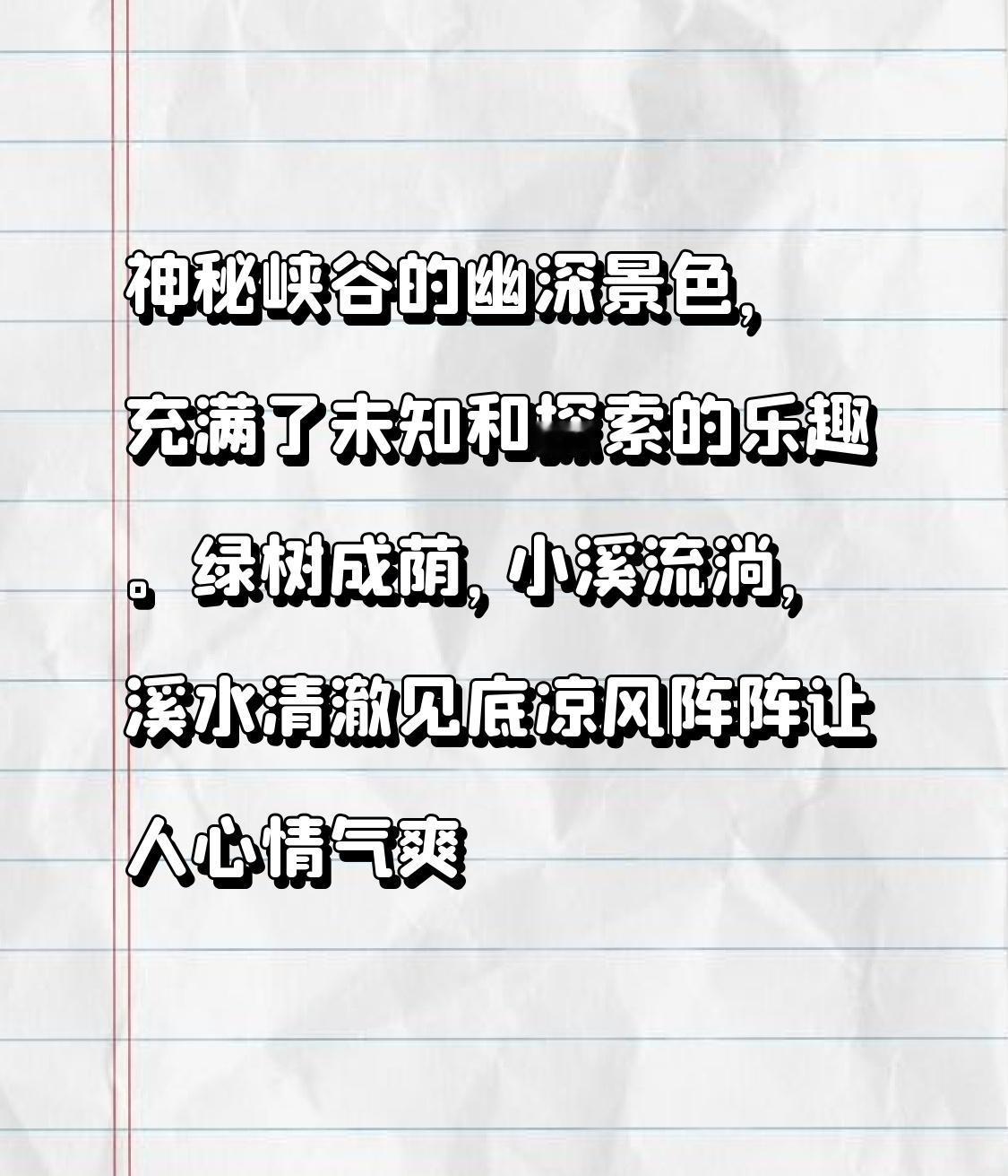 神秘峡谷就是大自然藏起来的宝藏之地。走进峡谷,满眼都是绿树成荫,像进入了一个绿色的梦幻世界。脚下小溪潺潺流淌,溪水清澈见底,能看到小鱼小虾在石头间穿梭。 峡谷里的凉风就像一双温柔的手,轻轻抚去燥热,让人瞬间心情舒畅。而且这幽深景色里全是未知,每拐过一个弯,都可能有新的惊喜,说不定会发现不知名的野花,或者藏在角落里的小瀑布。这种探索的乐趣,就像拆盲盒一样,永远不知道下一秒会遇到啥,太让人着迷了。