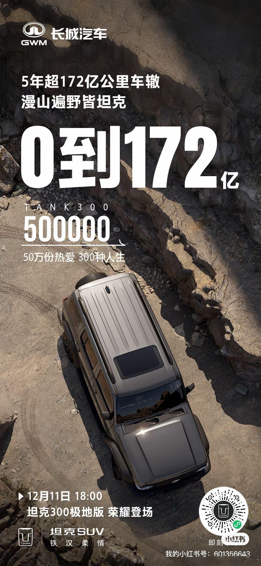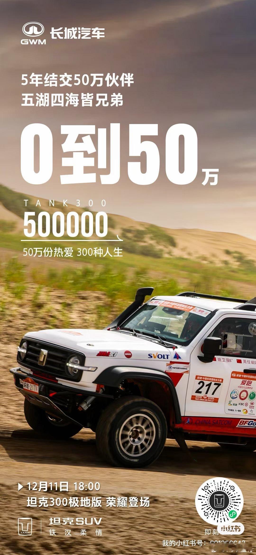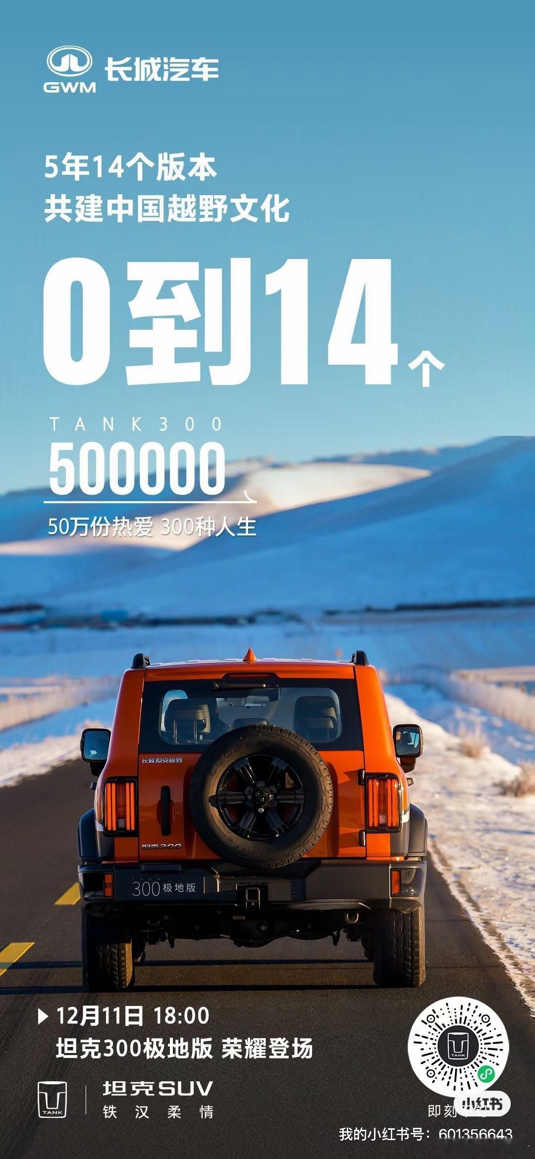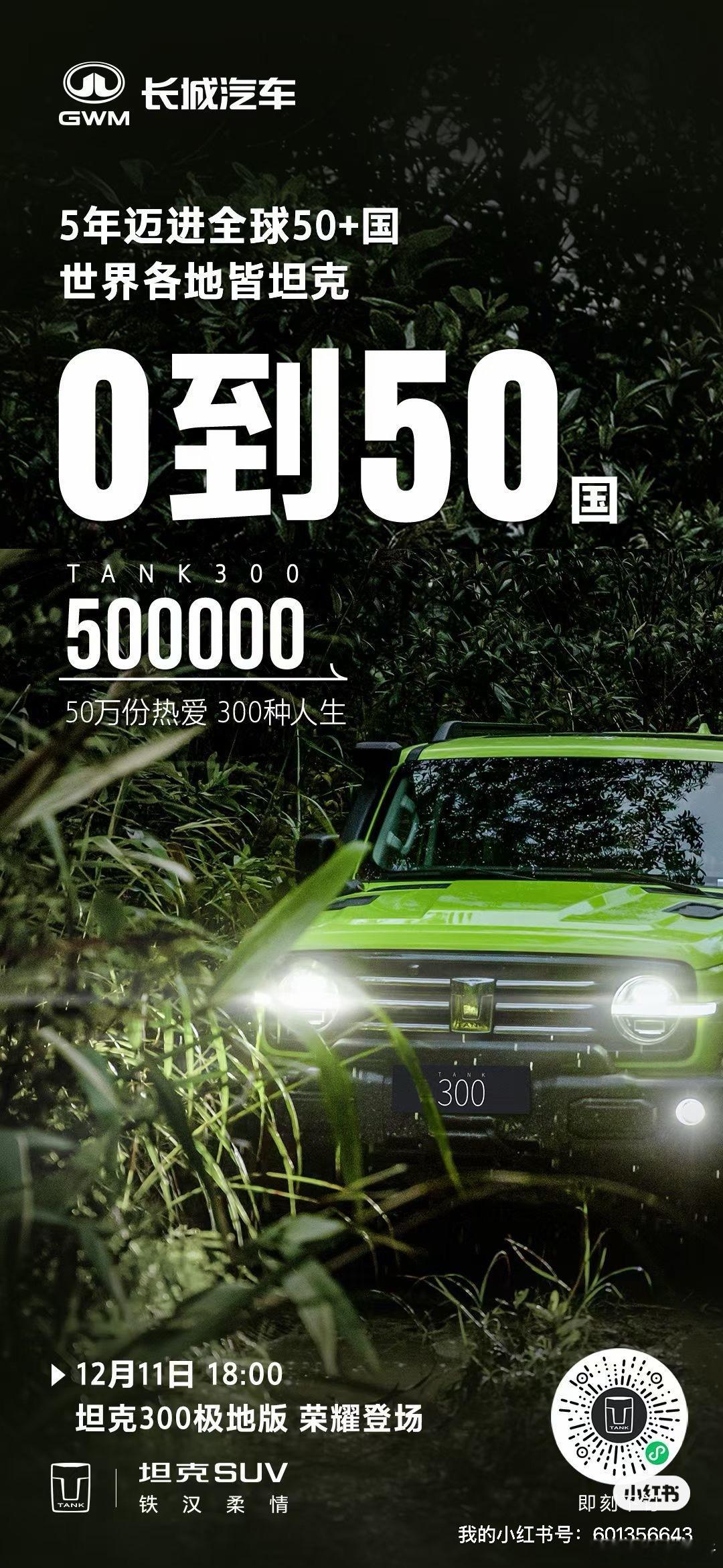 5年50个国度14个版本172亿里程数字见证 50万热爱 300种人生12月11日 18:00 坦克300极地版 荣耀登场!坦克300中国越野极地荣耀买一台车交一群朋友从长城车到长城站