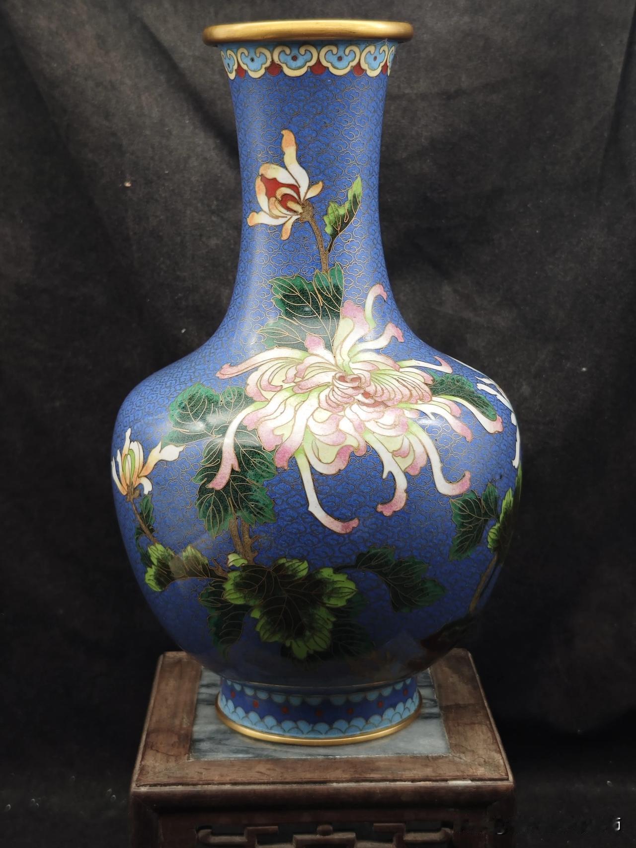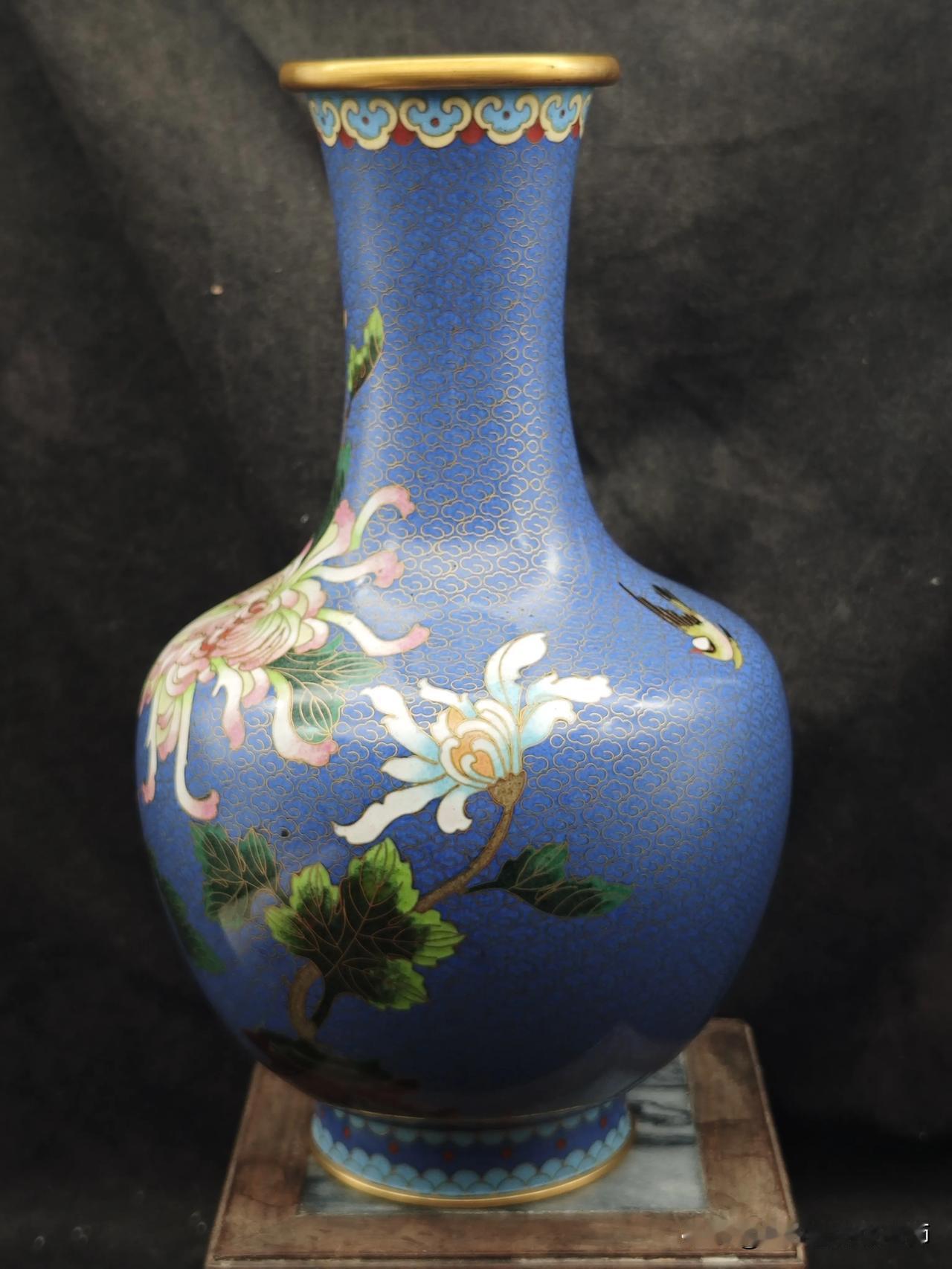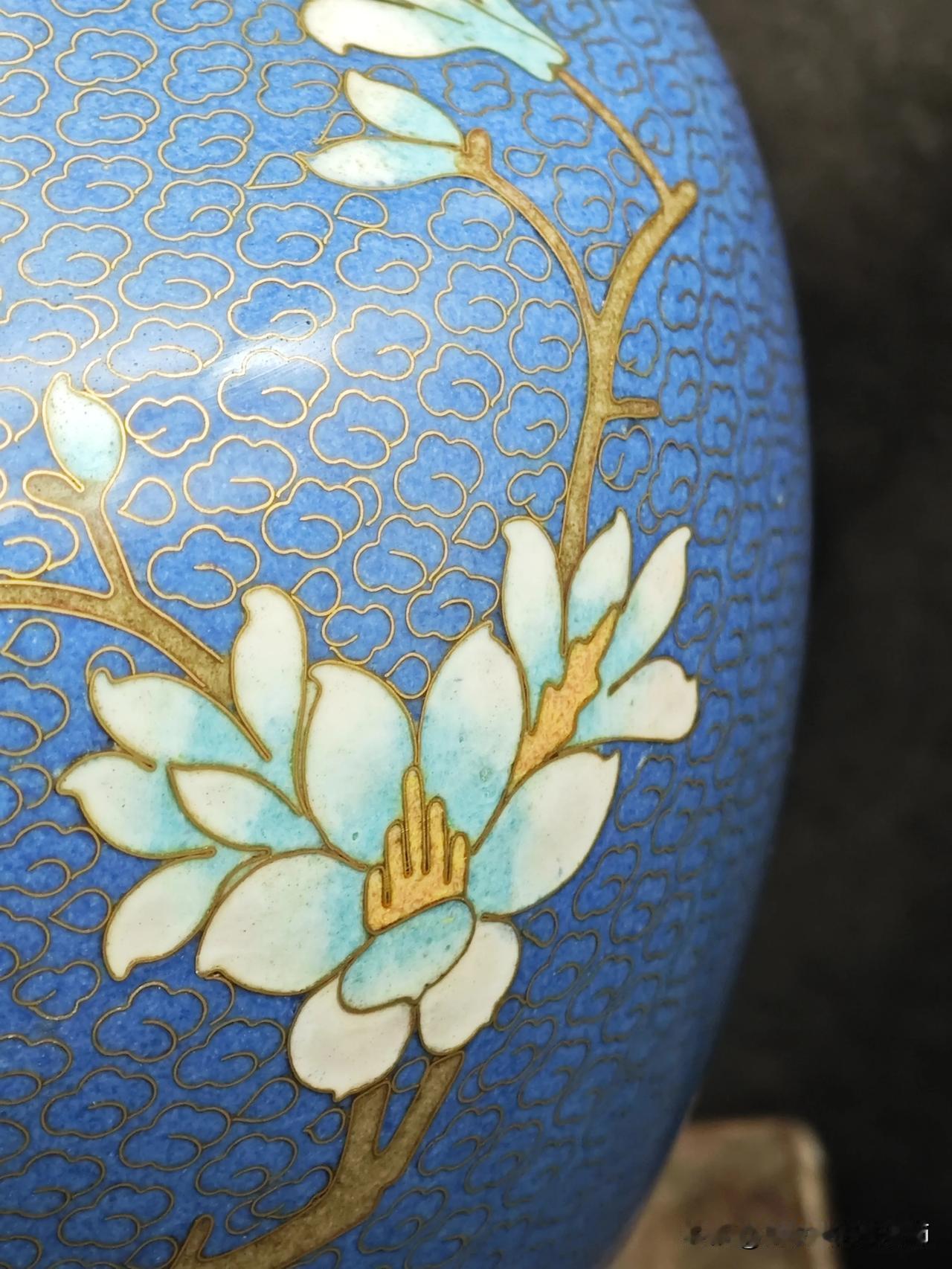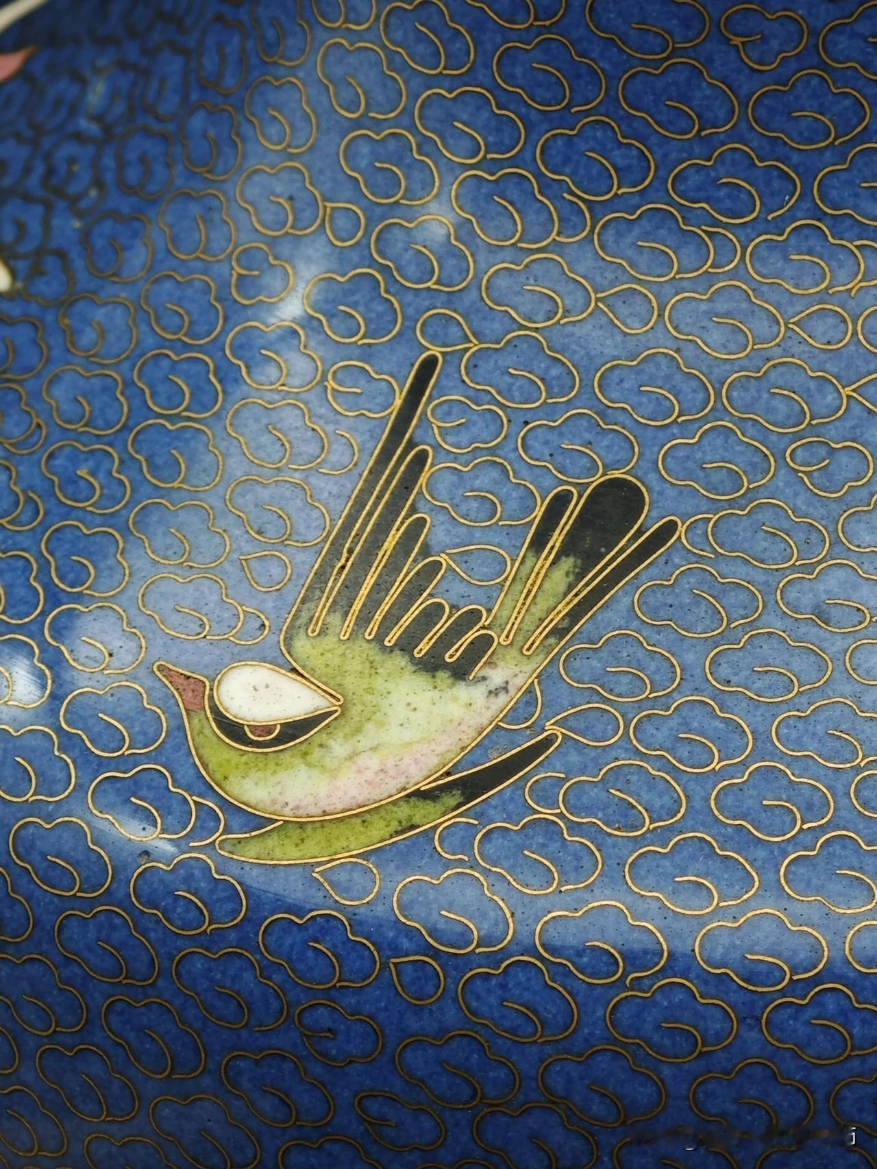 家人们,今天必须跟你们分享我的天大喜悦!跑了好几个地方,终于淘到一只超心仪的老景泰蓝天球瓶,现在看着它摆在那儿,我还忍不住乐呢~ 你们看这瓶身,经典的天青底色,上面用金丝掐出细密的卷云纹当背景,光这打底的工艺就够精致了。瓶身上的图案更是绝,一朵硕大的菊花开得雍容华贵,花瓣的粉白渐变晕染得特别自然,旁边还有玉兰花亭亭玉立,连枝头的小燕子都雕得活灵活现,翅膀的纹路、身上的色彩都特别生动,跟要飞出来似的。 瓶口还有鎏金的包边,搭配着如意云纹的装饰,瓶身高度大概28公分,器型是正儿八经的天球瓶,敦实又大气。打听了才知道,这是北京珐琅厂60-70年代出口创汇的老物件,那时候的匠人做活是真用心,掐丝细得跟头发丝一样,填釉也填得满满当当,一点不含糊。 把它往客厅的博古架上一摆,整个屋子的中式韵味都拉满了,既有老物件的岁月质感,又有景泰蓝独有的华丽,不管是自己赏玩还是家里来客看着,都特有面儿。说实话,现在这种品相好的老景泰蓝真的藏一件少一件,能收到这么合心意的,我感觉自己运气也太好啦!