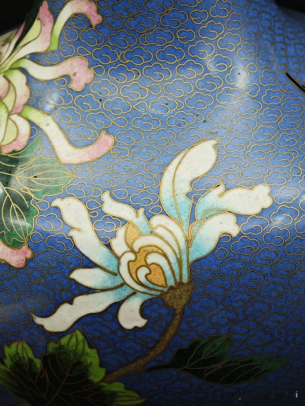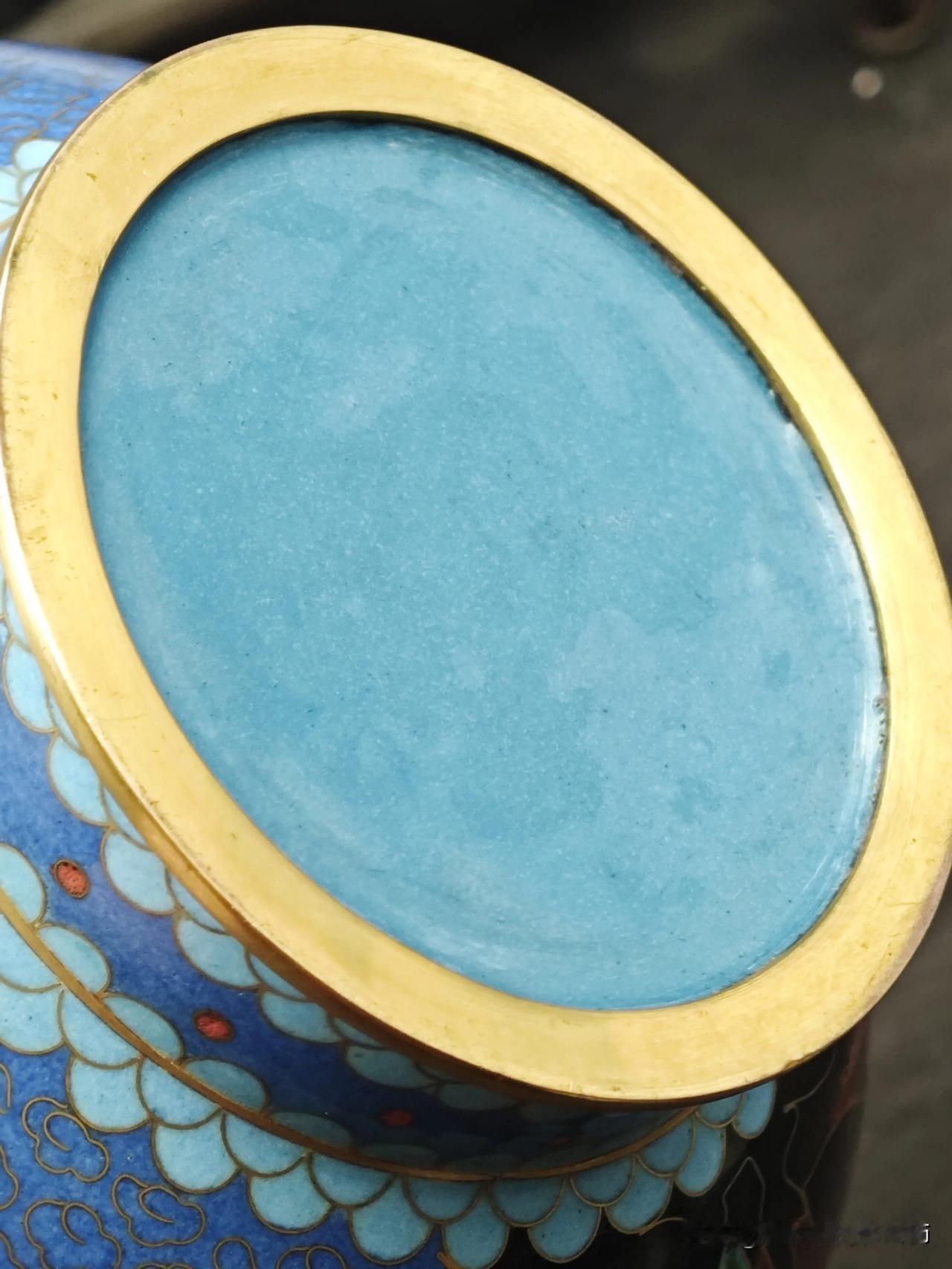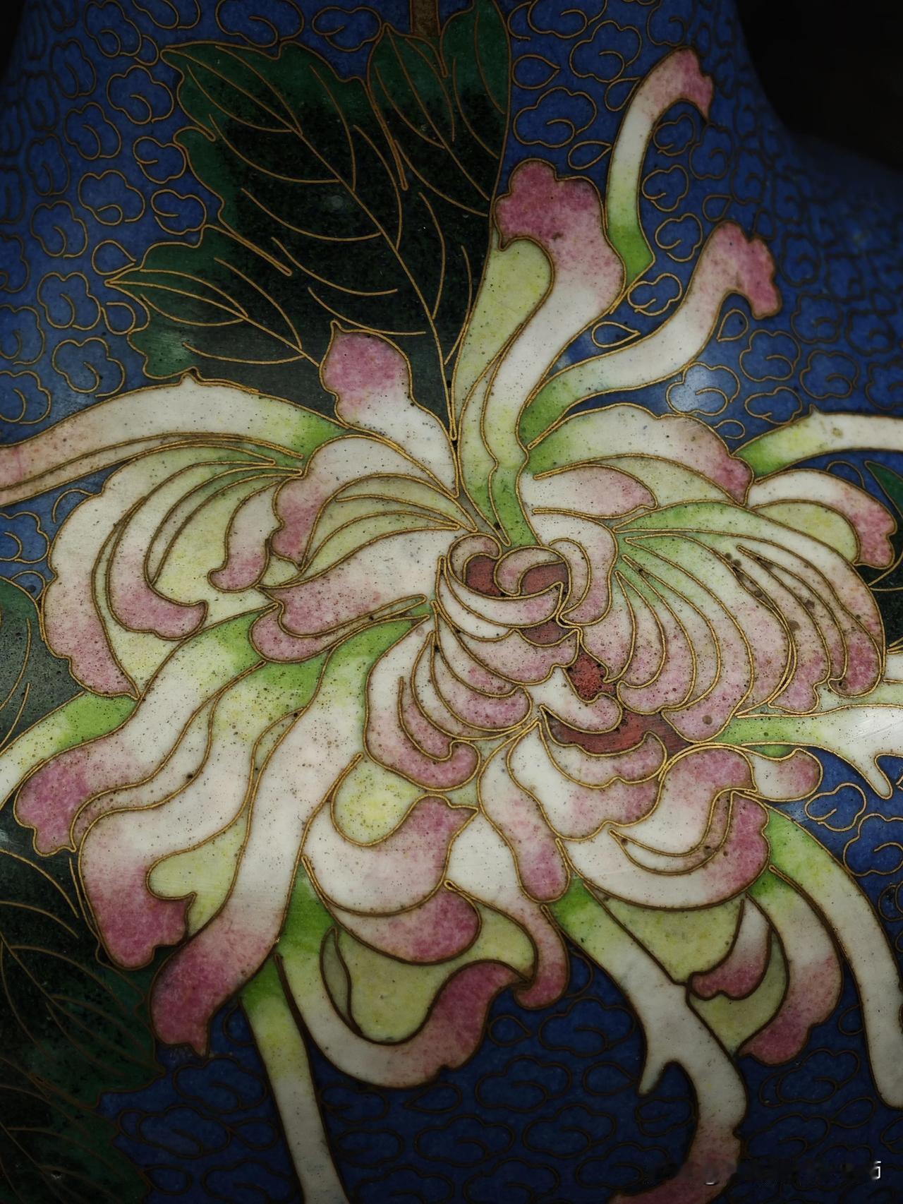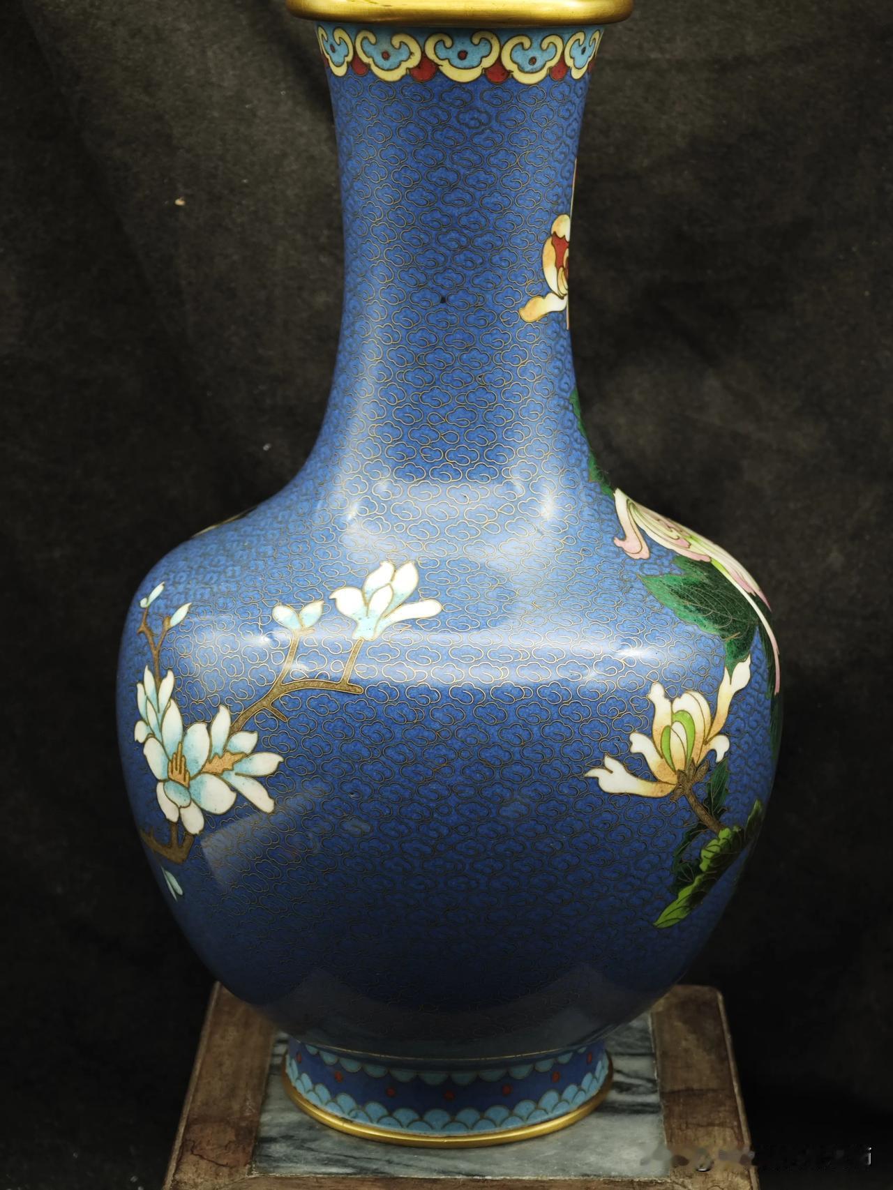 家人们,今天必须跟你们分享我的天大喜悦!跑了好几个地方,终于淘到一只超心仪的老景泰蓝天球瓶,现在看着它摆在那儿,我还忍不住乐呢~ 你们看这瓶身,经典的天青底色,上面用金丝掐出细密的卷云纹当背景,光这打底的工艺就够精致了。瓶身上的图案更是绝,一朵硕大的菊花开得雍容华贵,花瓣的粉白渐变晕染得特别自然,旁边还有玉兰花亭亭玉立,连枝头的小燕子都雕得活灵活现,翅膀的纹路、身上的色彩都特别生动,跟要飞出来似的。 瓶口还有鎏金的包边,搭配着如意云纹的装饰,瓶身高度大概28公分,器型是正儿八经的天球瓶,敦实又大气。打听了才知道,这是北京珐琅厂60-70年代出口创汇的老物件,那时候的匠人做活是真用心,掐丝细得跟头发丝一样,填釉也填得满满当当,一点不含糊。 把它往客厅的博古架上一摆,整个屋子的中式韵味都拉满了,既有老物件的岁月质感,又有景泰蓝独有的华丽,不管是自己赏玩还是家里来客看着,都特有面儿。说实话,现在这种品相好的老景泰蓝真的藏一件少一件,能收到这么合心意的,我感觉自己运气也太好啦!
