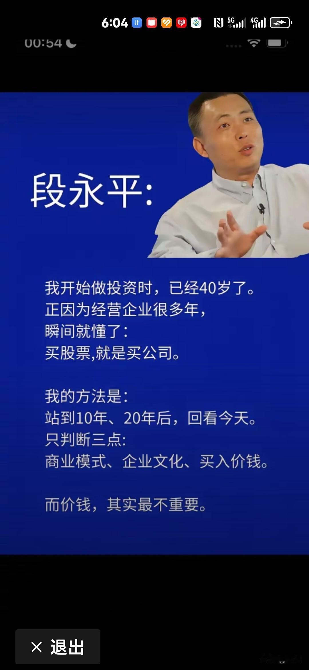 段永平的说法,我很认同。 我在不同的企业(行业)做高管二十多年了,分管过生产,销售,经营,也做过一把手,负责全面工作,后来入股市,觉得很快就入门了。 大家爱说买股票就是买企业,我觉得不准确。我的理解是买股票就是买企业的经营趋势。趋势越是明确,越值得买。 一个企业,如果经营趋势不明确,不管它是经营良好,还是低谷期,都不要买。 像企业文化,商业模式等,一般人没有机会深入接触吃透。