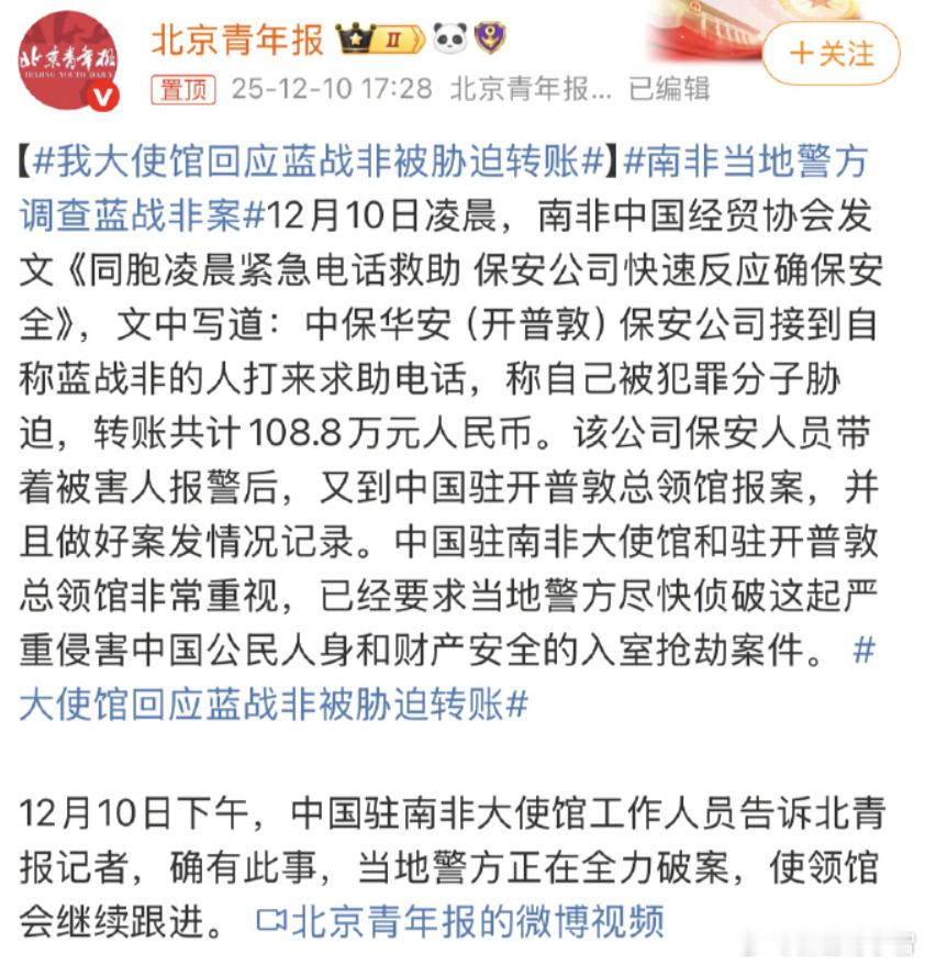这两天刚准备认真看看发布会啥的,就看到非哥的内容,今天的最新消息就是“胁迫转账108.8万人民币” 直接转走了一部尊界S800 全款的感觉不过暂时好奇的是,这个中保华安保安公司是怎么样的一个保安公司?在网上搜了下资料, 好像是国内为主,兼一些东南亚、中东等地区。不过也确实是反应很快,不然非哥就。。。。 看后面多久侦破吧。。。先不说了,我去看看岚图追光 L 发布会先 我大使馆回应蓝战非被胁迫转账