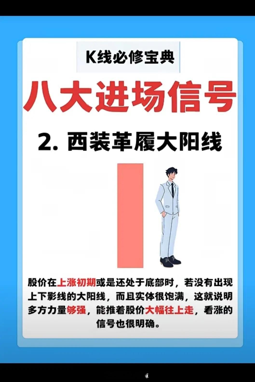 “西装革履大阳线”是短线强进场信号,核心是底部/上涨初期的光头光脚大阳线+放量+突破关键位,形态规整、力量感足,像穿西装一样利落,代表多方强势掌控盘面。形态:光头光脚大阳线,上下影线极短或无,实体饱满,单日涨幅通常≥5%,最好是涨停或接近涨停 。条件:1. 位置:处于长期下跌后的底部或上涨初期,非高位诱多。2. 量能:当日放量,至少为近5日均量的1.5倍,确认资金进场。3. 突破:突破前期平台、下降趋势线或关键均线,打开上行空间。4. 确认:次日不回落,收盘价站稳大阳线实体上沿,量能不显著萎缩。
