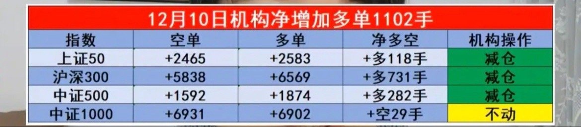 12.10周三晚间 机构减仓!中信小幅加仓最新期指数据来了!中信净增加空单774手机构净增加多单1102手从期指数据看,今天中信小幅加仓,但是机构却是减仓的,需要警惕。今晚美联储会议纪要。降息则明天高开低走,年底临近,需要控制好仓位。不作为投资买卖建议,仅供参考、