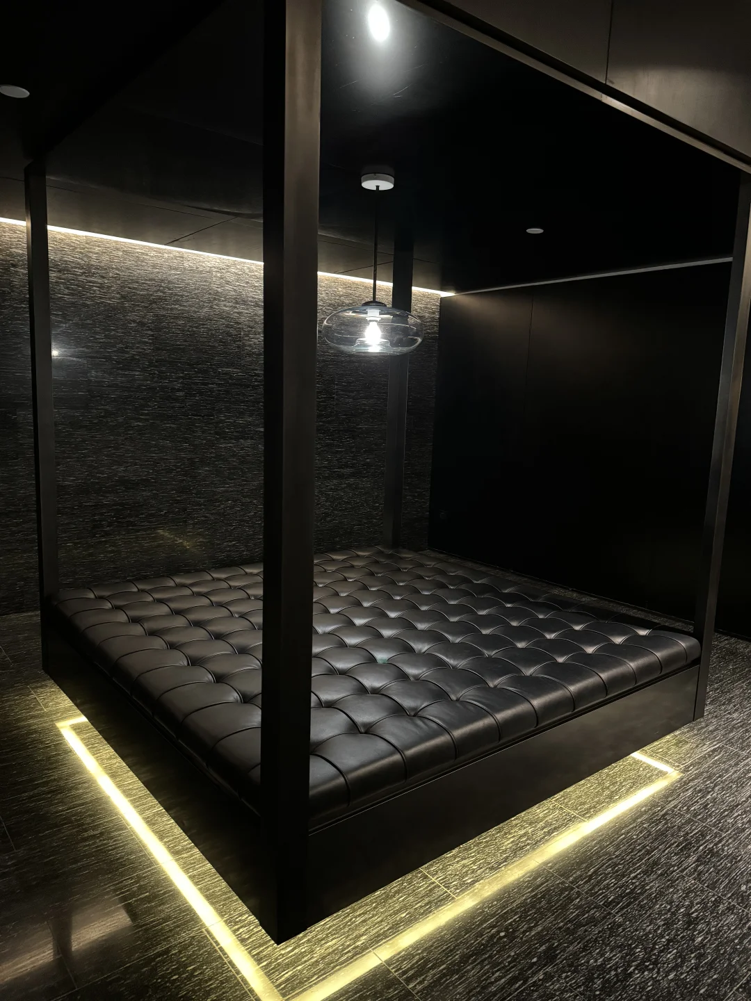 负一楼的洗手间门口就是很多网红都有来拍的超大黑色沙发和超大全身镜