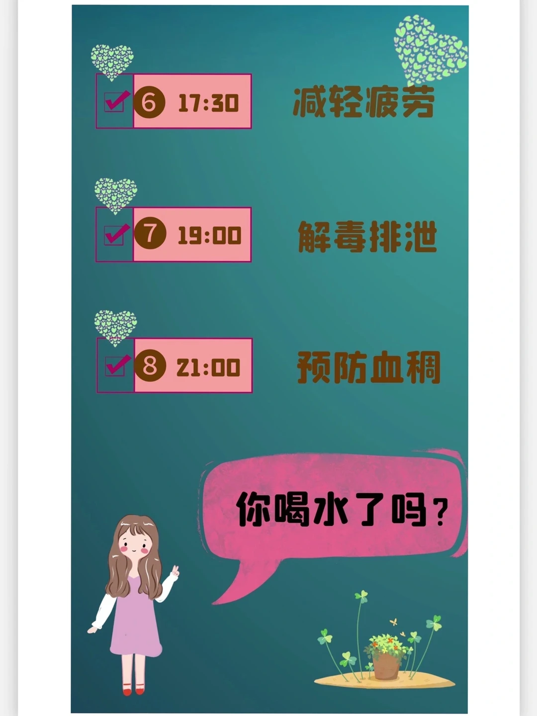 15.00第❺杯水,燃脂最佳时期,这个时候做有氧运动最有效果,但要给身体补充适当水分。
