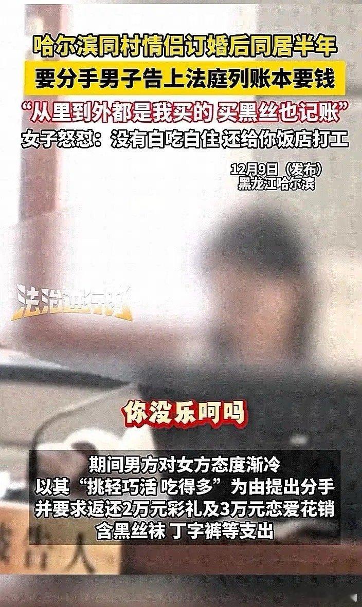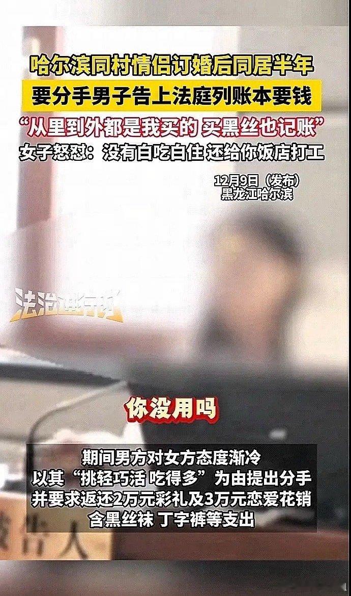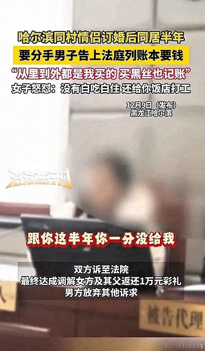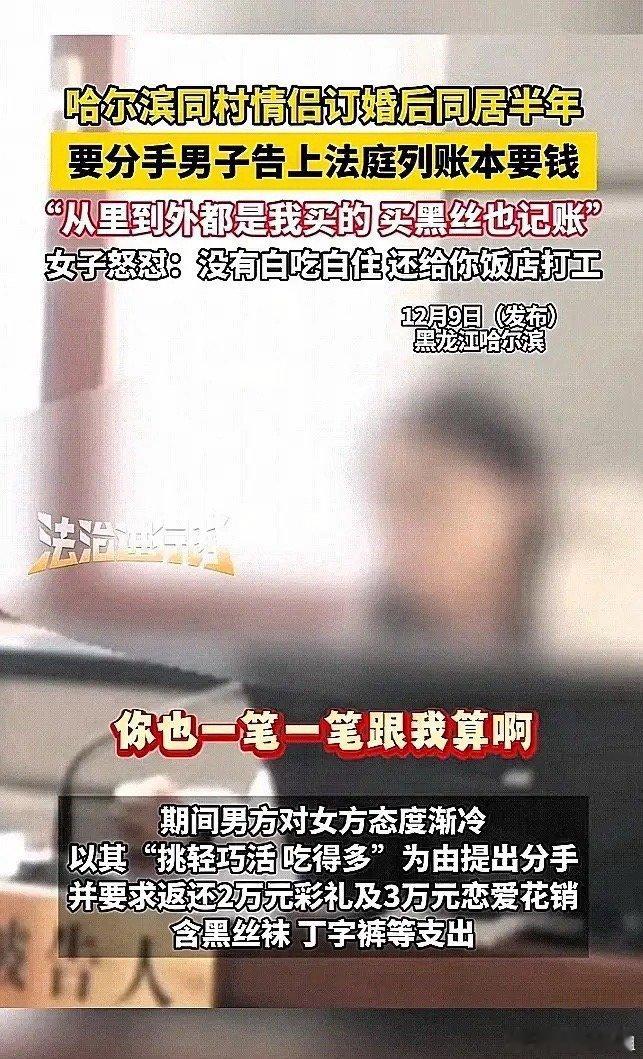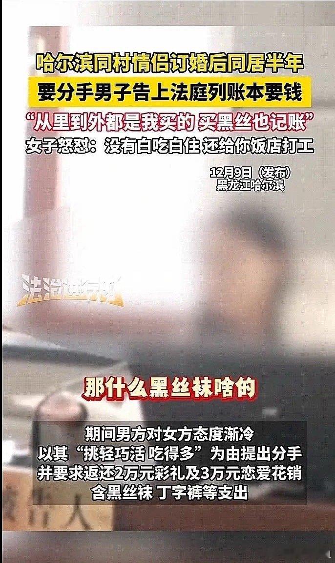 好离谱!情侣同居半年,男子嫌弃女友干活“偷奸耍滑”,还吃的多,提出分手,拿出黑丝袜丁字裤账单向女友索要恋爱开销,两人直接闹上了法院。这俩人都是哈尔滨五常同村的人,是经过媒婆牵线搭桥促成的好事,两人当即订婚,男方家付了2万块“头茬礼”。过后两人奔赴河北男方家的麻辣烫店一起生活,女子平时就在店里帮忙干活,这一干就是大半年,可干着干着男子就觉得女友“专挑轻巧”的事儿做,活干的少,还吃得“贼多”,是越看越不顺眼,认为女友不是自己心目中的好妻子。就向女友提出分手,并要求女友归还彩礼2万元以及恋爱开销3万元。女子一看账单气的肝疼,男子算的太清楚了,里面是啥都有,大到彩礼小到袜子。男子在法院上还说女友“从上到下,从里到外,都是花的我的钱”。女子直接回怼“我给你打那么长时间的工,你一分钱也没给过我,那些快乐装备你没乐呵吗”?最后,法院表示购买私密物品花销不予支持,女方及其父返还男方彩礼10000元,男方放弃其他诉求,双方达成和解。