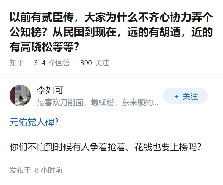 以前有贰臣传,大家为什么不齐心协力弄个公知榜?从民国到现在,远的有胡适,近的有高晓松等等?