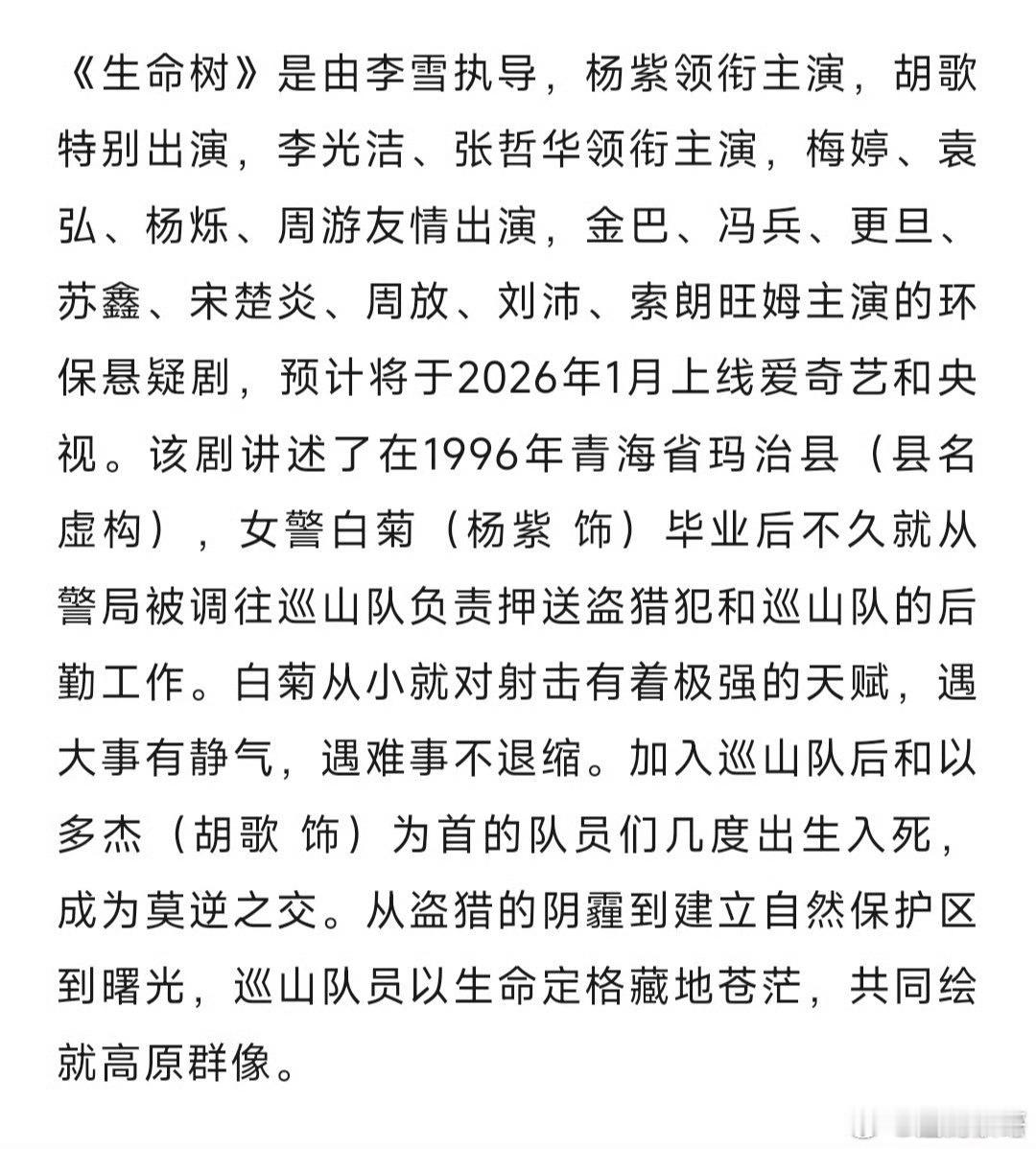 杨紫的生命树正式开启播前招商,下个月也就是2026年1月就将在央视和🥝播出,5月初正式开机10月31日拍摄半年杀青,1月就播,仅两个多月的后期制作就播堪称神速,超级期待