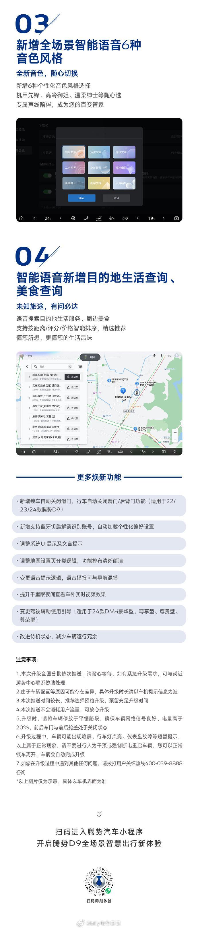腾势D9这次OTA升级,不仅是一次简单的功能迭代,更是对智能座舱体验的全面深化。新增的地图途经点编辑与排序、高速看板服务区作为途经点的智能化处理,不仅让导航更加个性化和精准,也为长途旅行带来了更高的便利性。这种细节上的打磨,展现了腾势在用户需求上的敏锐洞察力。更令人惊喜的是,腾势D9还推出了6种语音音色风格,给车主带来更加自然、亲切的语音交互体验。而智能语音目的地查询、生活服务等功能的加入,则体现了腾势D9在智能化服务上的全面升级,真正将车主的生活与出行无缝连接。这次OTA升级,不仅覆盖了22/23/24款腾势D9以及四座版,更为老车主带来了全新的体验,这在市场中是一个非常具竞争力的优势。与此同时,腾势D9的销量持续增长,已经稳居MPV市场的冠军,足以证明其在消费者心中的认可度和品牌力。🚀在智能化、舒适性与实用性不断提升的背景下,腾势D9无疑会吸引更多注重高品质出行体验的用户。随着这次OTA的发布,腾势D9的市场热度和销量势必会再上一个台阶!腾势D9智能座舱OTA升级销量冠军