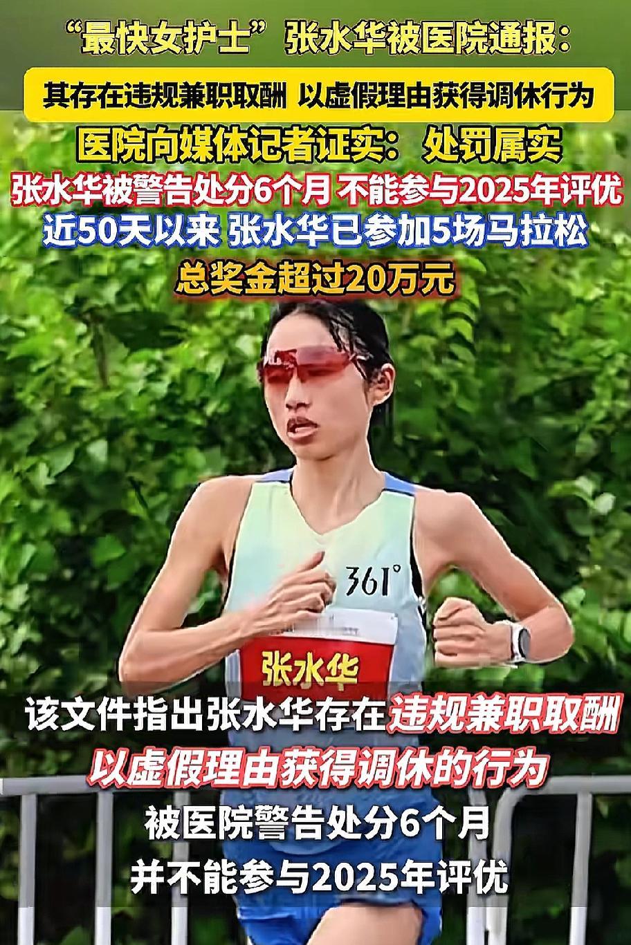 热爱跑马拉松的女护士张水华, 最终还是迎来了医院的处罚, 6个月的警告处分,和不能参与2025年的评优。 看了医院的通报,处罚她的原因有两点: 1、违规兼职赚取报酬。张水华与361°是签有代言的,但医院有规定从事兼职活动必须要先报备,征得同意了才行,张水华未履行相关的报备。 2、调休太多、以虚假理由获取调休。张水华为了参加马拉松多次申请调休,已影响了科室的排班。11月1日,更是用不实的理由骗取调休。,违反了职业道德准则。 有爱好没错,想坚持也没问题,但工作和爱好总得分清主次吧,几天就参加一场,同事被迫连轴转,没怨言才怪。 所以啊,凡事得有个度,不然就会招人恨,你们觉得呢?