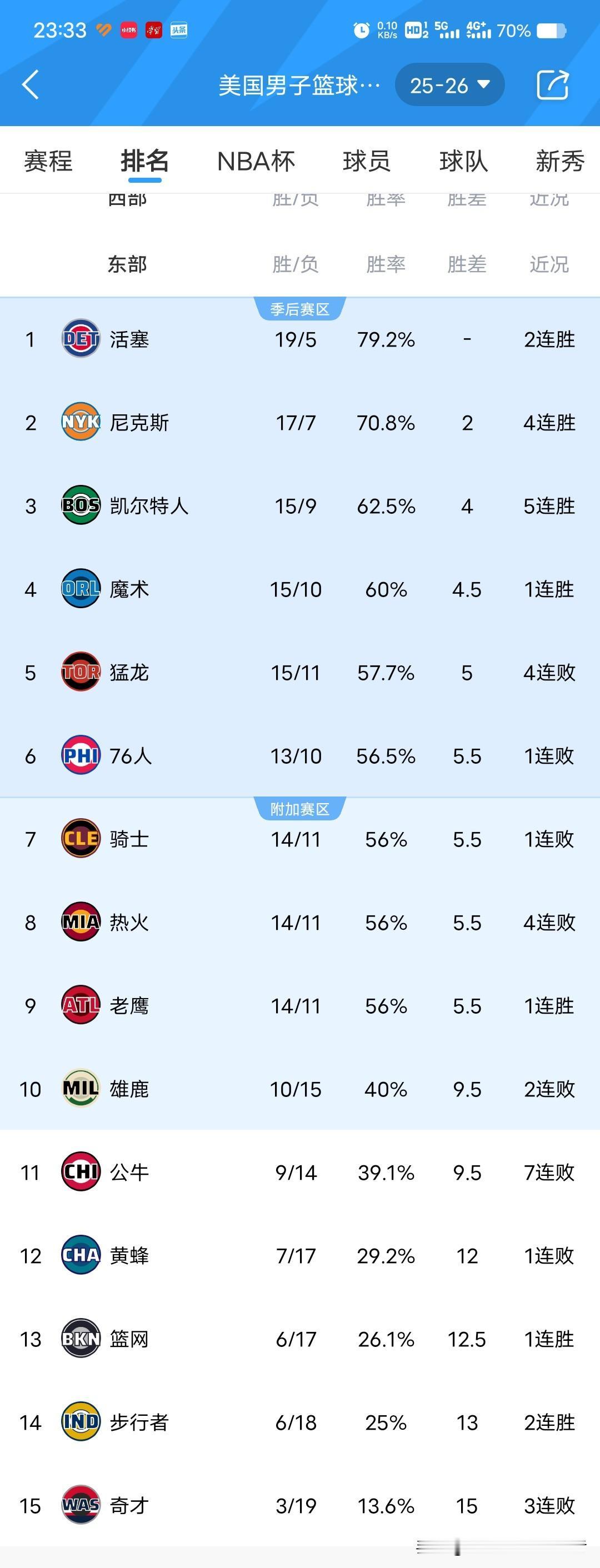 东部乱成一锅粥了! 活塞19胜5负,第1 尼克斯17胜7负,第2 凯尔特人15胜9负,第3 魔术15胜10负,第4 猛龙15胜11负,第5 76人13胜10负,第6 骑士14胜11负,第7 热火14胜11负,第8 老鹰14胜11负,第9 雄鹿10胜15负,第10 公牛9胜14负,第11 黄蜂7胜17负,第12 篮网6胜17负,第13 步行者6胜18负,第14 奇才3胜19负,第15 活塞上赛季排名东部第6,本赛季强势登顶东部榜首。尼克斯紧随其后,豪取4连胜,位居第二。凯尔特人在赛季前期一度滑落至倒数第四,不过最近凭借5连胜稳住了前三的位置。雄鹿仅排在第十,缺少了字母哥的他们,如今胜率只剩40%。上赛季的东部冠军步行者,如今排在倒数第二;上赛季东部第一的骑士,仅位列第7。而奇才依旧状态低迷,以3胜19负的战绩排在东部倒数第一。