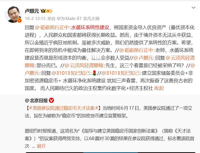 震耳欲聋!2025年10月2日,卢麒元:境外资本无法从中获益,所以近乎疯狂的抵制!对人民群众和国家都有长期利益的水循环系统性建设,让外国为之害怕! 不知大家是否知晓“水循环系统性建设”?在我国人均水资源量仅为世界平均水平的35%,且农村污水水处理率不足50%的情况下,卢麒元就提出了这一建设性的构想。 在提出之后就引起了极大的争议,从长远去看,该系统的建设不仅能够给我国人民群众,还能够给国家带来长期的收益。 早在2022年的时候,他就已经明确指出,加强全国水循环系统建设意义重大。在建设之后,我国的农田与水利重新规划,能够使我国的土地利用率可再提升一倍,同时将提供我国所需粮食的140%。 如果能够实现的话,届时我国生产的粮食不仅能够自给自足,甚至是还能够有余剩的部分去用做出口。但是该系统却一直没有得到推进,所以当美国参议院为了“稳定币”的加密货币建立监管框架,所以通过了一项立法后。 2025年10月2日的时候,他在个人社交账号发文直接指出。因为境外资本无法从中获益,所以近乎疯狂的进行抵制。即便是面对了多次威胁,但仍旧提供了系统性的方案。 境外资本害怕,在该系统的加持下,一个更加强大的新中国从中诞生。所以他们便疯狂的进行抵制,而这也进一步的反映出来了,外国资本敬畏中国的心。正是因为畏惧他们才会抵制,才能害怕中国的土壤再进一步的被有效利用。 对此,您怎么看? (信息来源:卢麒元-20251002) (信息来源:卢麒元:加强全国水循环系统建设,重视水和土壤污染 能大幅提高我国粮食产量-新浪财经)
