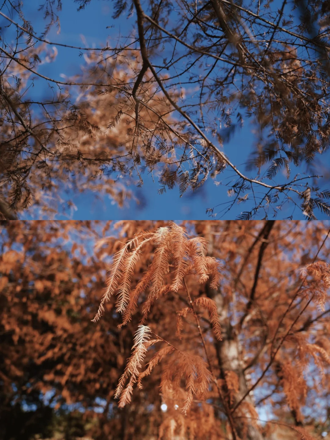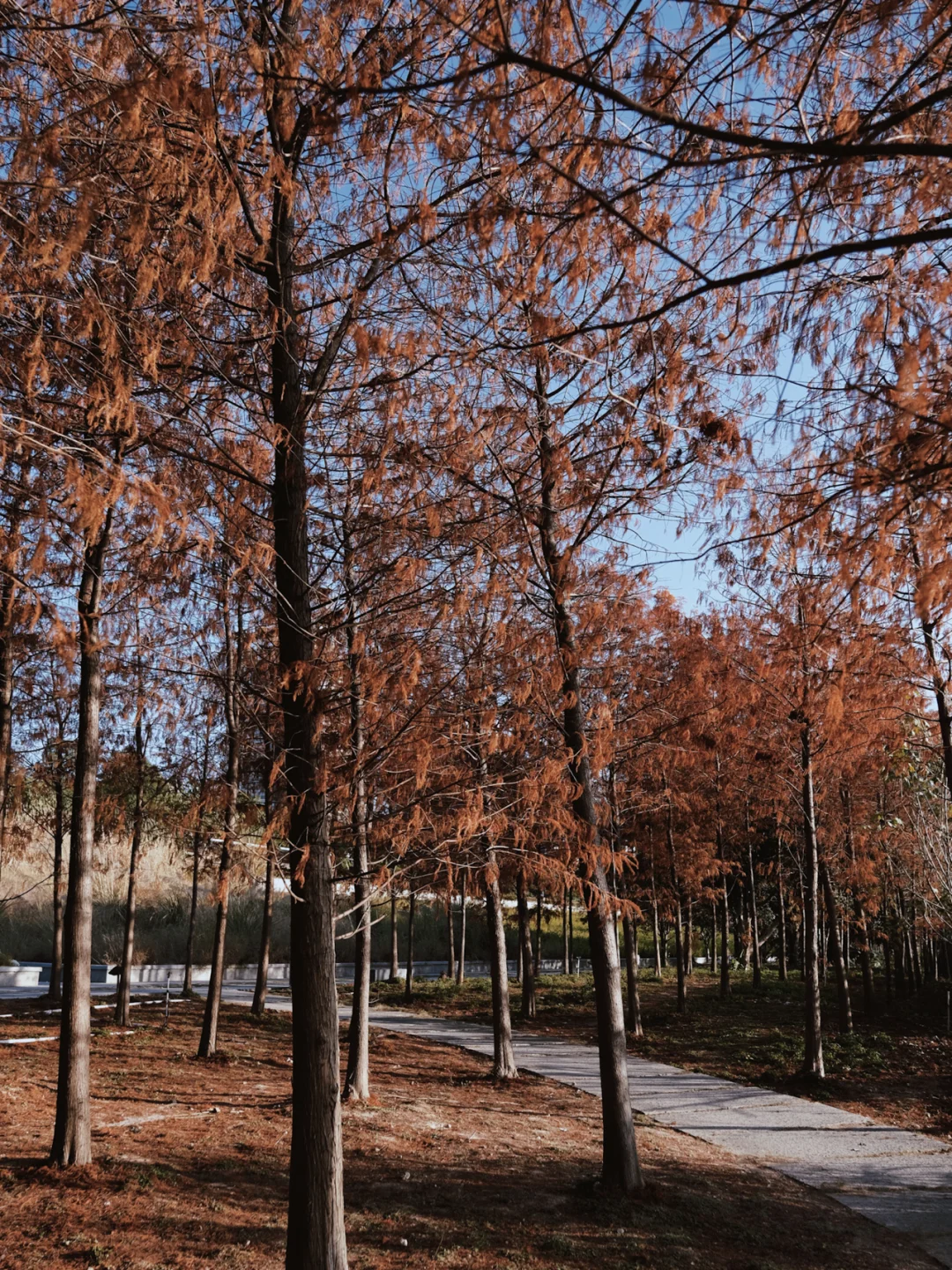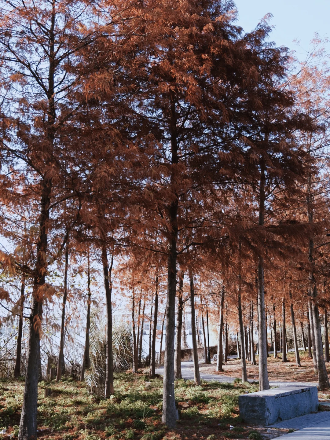 🍁 落羽杉靠近江边,有一条蜿蜒的小道,望的到大桥,这个取景角度很赞(图1)