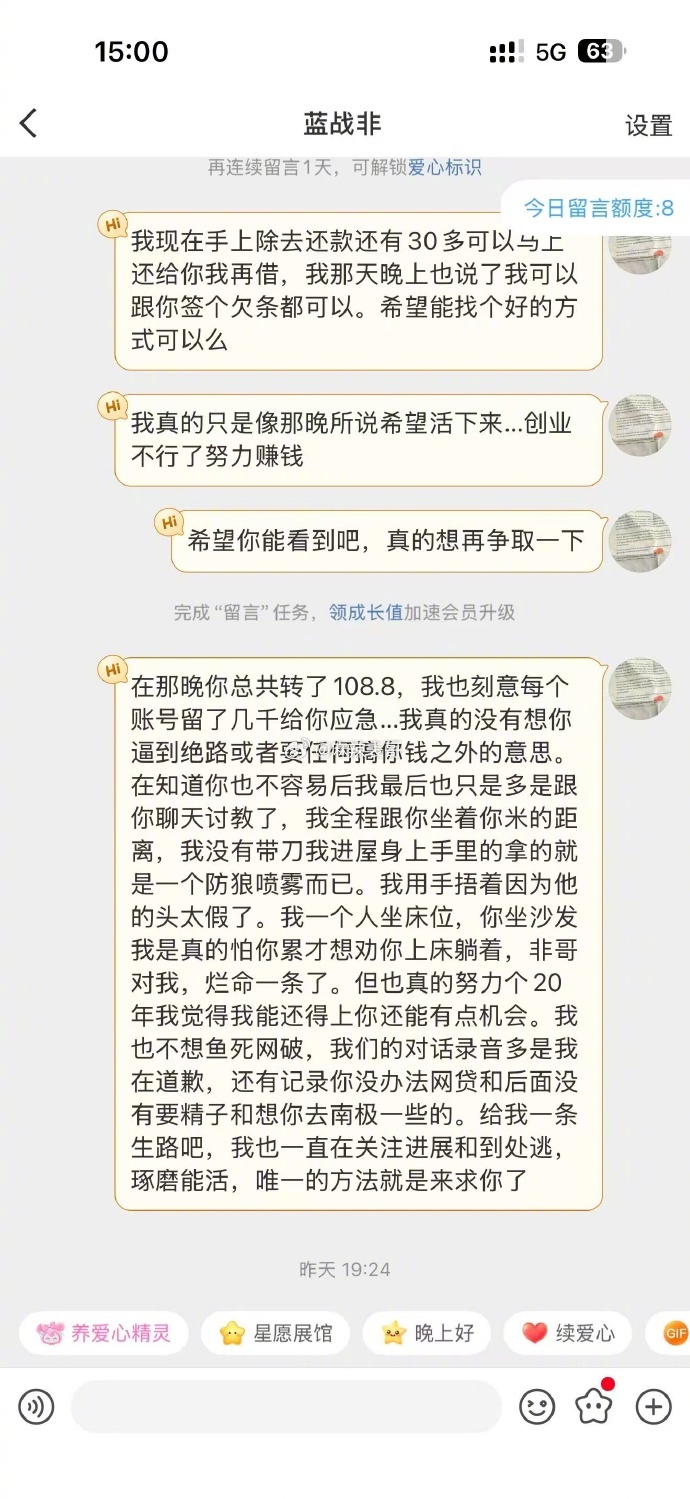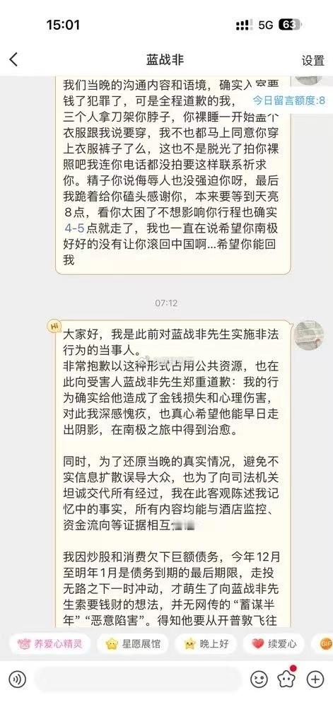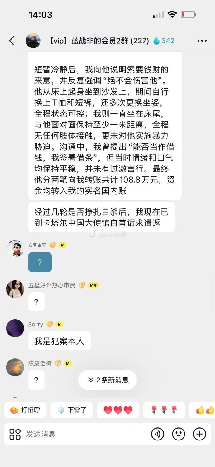 疑似蓝战非被绑架的作案人在蓝战非的粉丝群里发声了1、说自己炒股欠债,一时冲动,才萌生了向蓝战非索要钱财的想法,并无网传的“蓄谋半年”“恶意陷害”,得知蓝战非行程后才临时订了机酒;2、凭借同是中国人的身份,冒充蓝战非先生补办了房卡;3、找的同伙之后就走了,只有自己留在了酒店,网传“多人围堵”“架刀脱衣”均为不实信息,是蓝战非裸睡醒来后受到惊吓;4、最后让蓝战非给自己转了108w