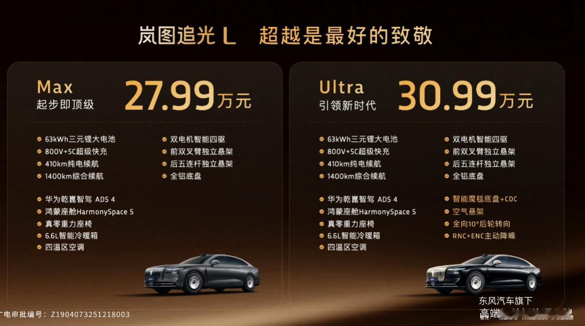 27.99-30.99万的岚图追光L打遍56E都够了基础参数:5125*1985*1522mm,轴距:3010mm(C级车)驱动形式:插电混动+双电机四驱发动机:1.5T(105kW)电机功率:150+250kW油箱容积:51L纯电续航:410km(综合1400km)电池容量:63kWh充电平台:800V/5C悬架:前双叉臂/后五连杆零百加速:4.8s智驾系统:华为乾崑智驾 ADS 4座舱系统:鸿蒙座舱5.1智驾硬件:1*192线激光雷达/3*4D毫米波/12*超声波屏幕:10.25仪表盘+16.3中控屏+8扶手控制屏+39AR-HUD外观颜色:黑/白/金黑/金红/金/灰内饰颜色:灰/白/红后备厢尺寸:414L轮毂尺寸:20寸内饰配置:麂皮绒包覆+真木饰板+氛围灯其他配置:6.6L冷暖冰箱(-6/50°C)/全车隔音玻璃+二排私隐玻璃/电吸门/23扬声器+头枕音响27.99万 MaxADS4+智慧泊车/方向盘加热/50W无线充/19寸轮毂主副驾电调+坐垫延伸/后排座椅调节/电尾门副驾零重力/四座通风加热按摩/四温区空调30.99万 Ultra20寸轮毂/悬浮车标双电机四驱/空悬+CDC+后轮转向+魔毯+空悬/主动降噪其他:膨胀金2000抵5000置换补贴5000元教授觉得这价格符合追光L的定位的,5.1米的车厂,3米多的轴距,还有副驾零重力。高配还有后轮转向和魔毯,有华为智驾的加持下,可以说是独一份了。对比传统的5、6、E来说,那可以说是配置上的降维打击了。不过以现在市场来说,教授还是觉得这车还能便宜一点,再下个1万块,那就性价比很高了。岚图岚图追光L追光L