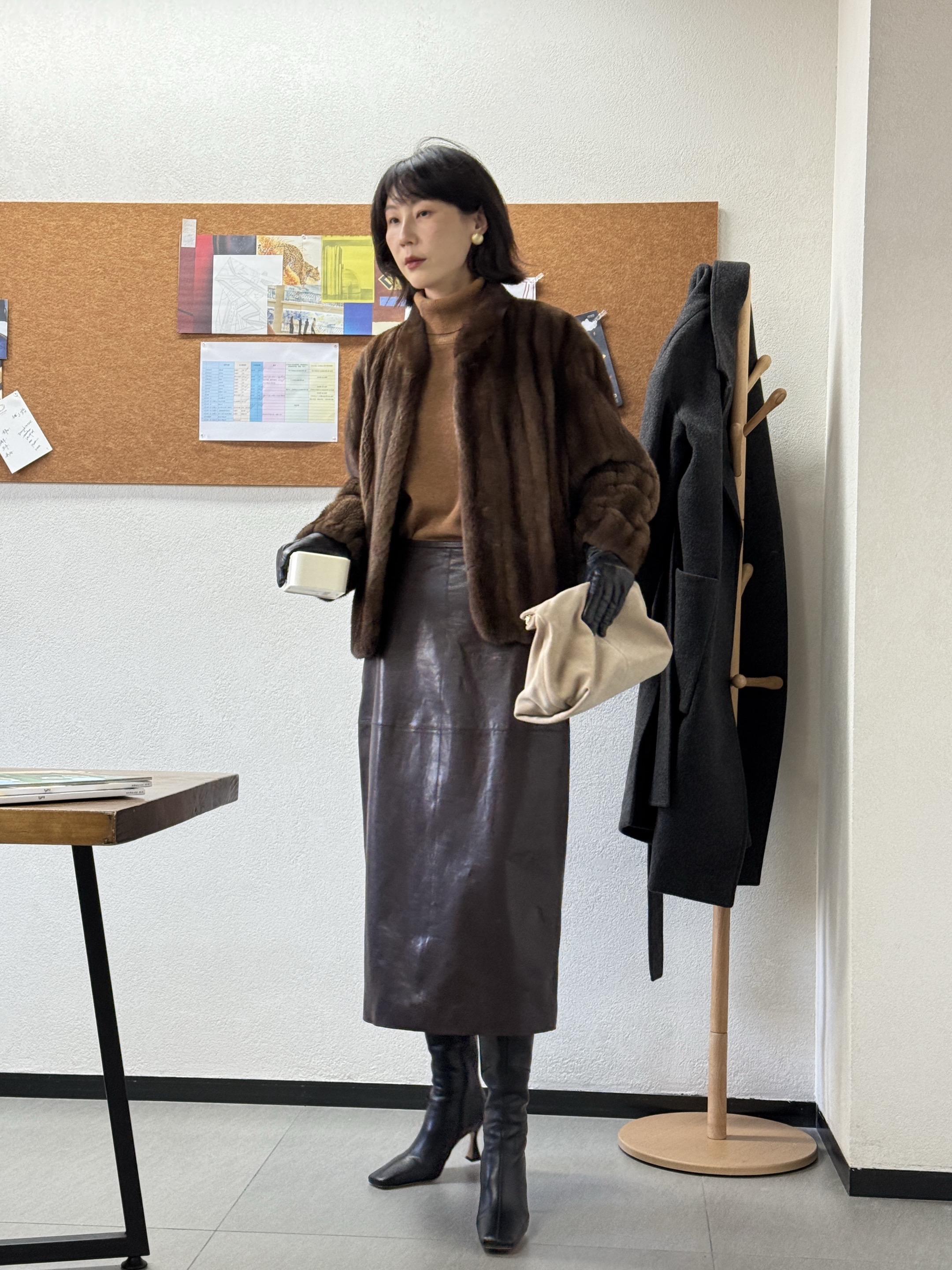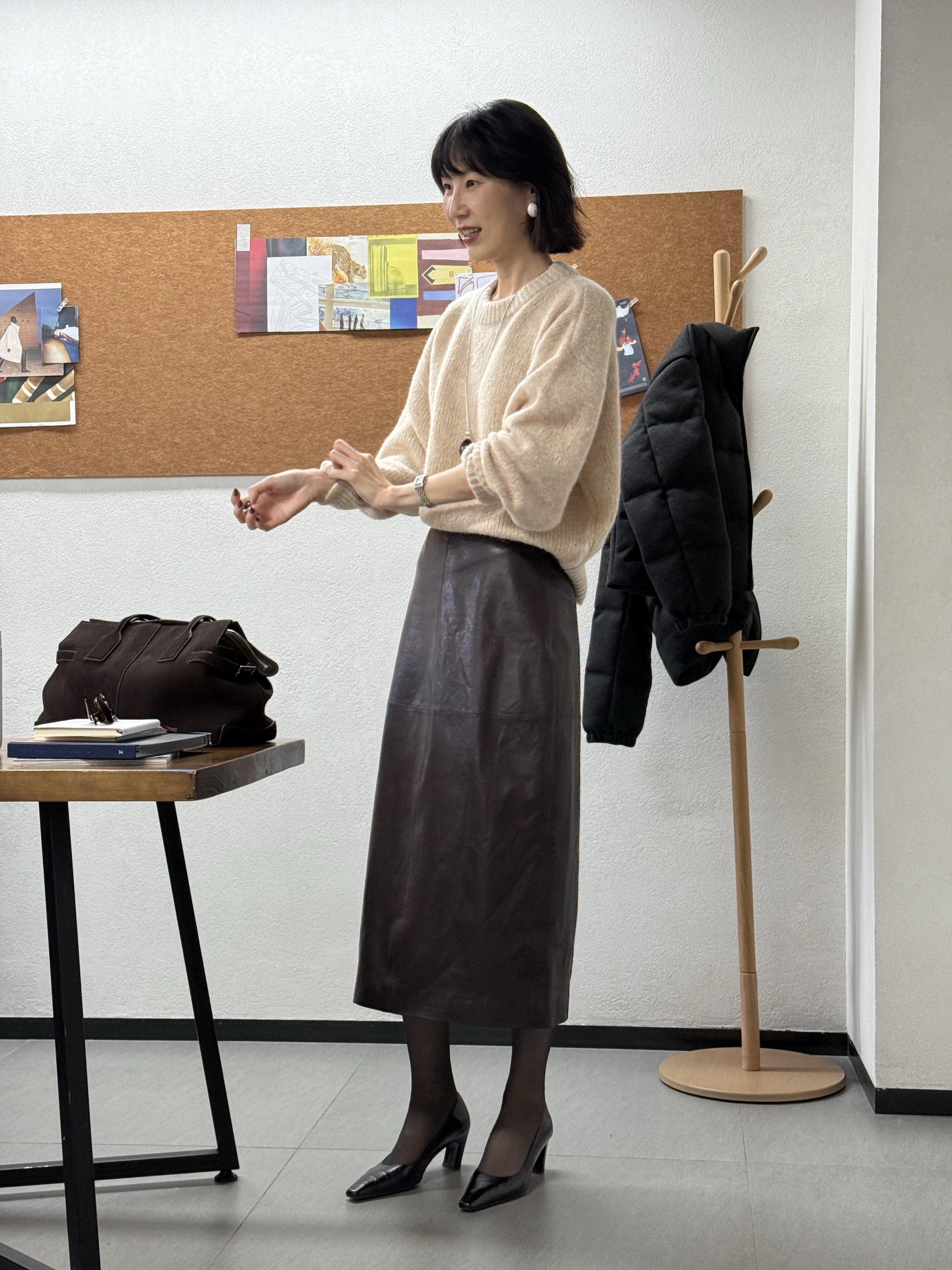 皮裙2个通勤Look配高跟或者长靴都不错。