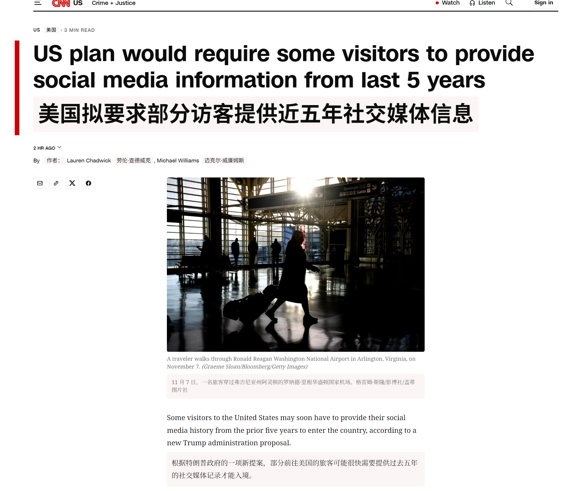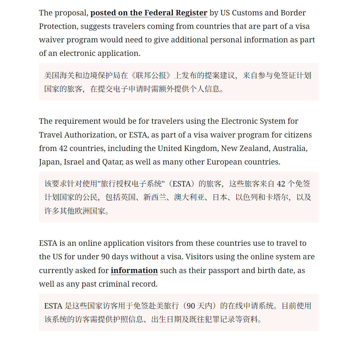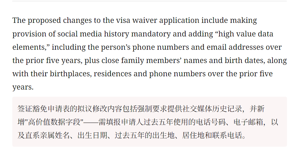 🔻CNN:根据特朗普政府的一项新提案,部分前往美国的旅客可能很快需要提供过去五年的社交媒体记录才能入境。🔻这些旅客来自 42 个免签计划国家的公民,包括英国、新西兰、澳大利亚、日本、以色列和卡塔尔,以及许多其他欧洲国家。🔻签证豁免申请表的拟议修改内容包括强制要求提供社交媒体历史记录,并新增"高价值数据字段"——需填报申请人过去五年使用的电话号码、电子邮箱,以及直系亲属姓名、出生日期、过去五年的出生地、居住地和联系电话。热点现场海外新鲜事