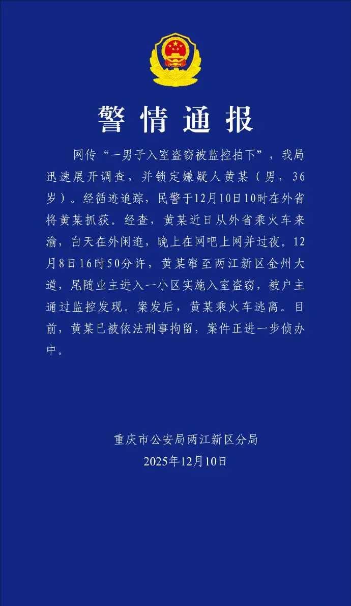 “我把你录下来了!” 12月8日下午4点50分,重庆两江新区金州大道某小区,户主盯着手机监控画面,对着画面里的陌生男子霸气喊话。让人啼笑皆非的是,正在实施盗窃的男子愣了一秒,竟对着摄像头慌忙回应:“抱歉,我不来了!”随后丢下作案意图,仓皇逃离现场。 这戏剧性的一幕,源自36岁嫌疑人黄某的一场“翻车盗窃”。警方通报显示,黄某近日从外省乘火车窜至重庆,白天四处闲逛踩点,晚上窝在网吧过夜。案发当天,他尾随小区业主混入居民楼,本想趁家中无人盗走财物,却没料到户主安装的监控早已布下“天罗地网”。 户主起初以为画面里的人是家人,仔细一看发现是陌生男子在屋内翻找,当即通过监控远程喊话震慑。而黄某的秒怂回应,被网友调侃“史上最有礼貌的小偷”,相关视频很快在网络传开。但他并未就此收手,案发后迅速乘火车逃往外省,企图躲避追责。 天网恢恢,疏而不漏。重庆市公安局两江新区分局接到报警后,迅速锁定黄某身份和行踪,循迹追踪其逃亡路线。12月10日上午10时,民警跨省出击,成功将黄某抓获归案。从作案到落网,全程仅用48小时,目前黄某已被依法刑事拘留,案件正在进一步侦办中。 这起案件既让人忍俊不禁,也给网友敲响警钟:“监控真是防盗神器,小偷连狡辩的机会都没有”“以为说句抱歉就能溜?违法犯罪可没‘回头路’”。警方提醒,冬季是入室盗窃高发期,居民应安装可靠监控设备、锁好门窗,遇到不法分子切勿硬刚,及时报警并留存证据,才能有效守护财产安全。