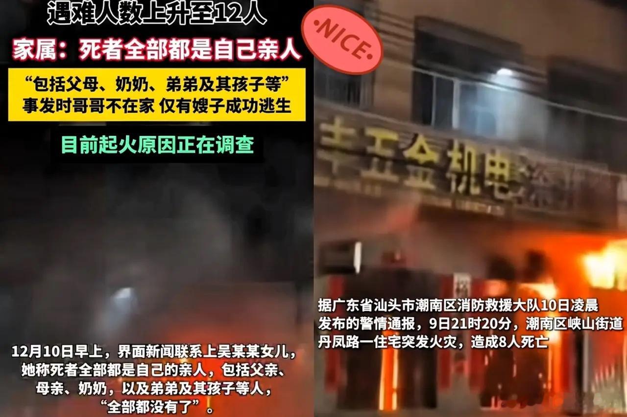 看了汕头起大火的四层房子,才知道为什么一楼起火,全家12口都没逃掉了,家家户户装的防盗网,焊死在墙上打不开,火一烧起来,窗户成了死路;楼间距挤得喘不过气,连个户外楼梯都没有,室内楼梯被火堵死就只能等死;一楼偏偏堆着五金店的易燃品,火苗舔上来根本挡不住;一家人住得集中,晚上九点多正忙着陪娃、辅导作业,等发现火大了,早就晚了。说真的,这些哪是什么意外?全是平时攒下的隐患。你家防盗网能随时打开吗?楼道有没有堆杂物?真出事了,你敢保证自己能顺顺利利跑出去?评论区说说你家最该改的安全隐患,别等出事才追悔莫及