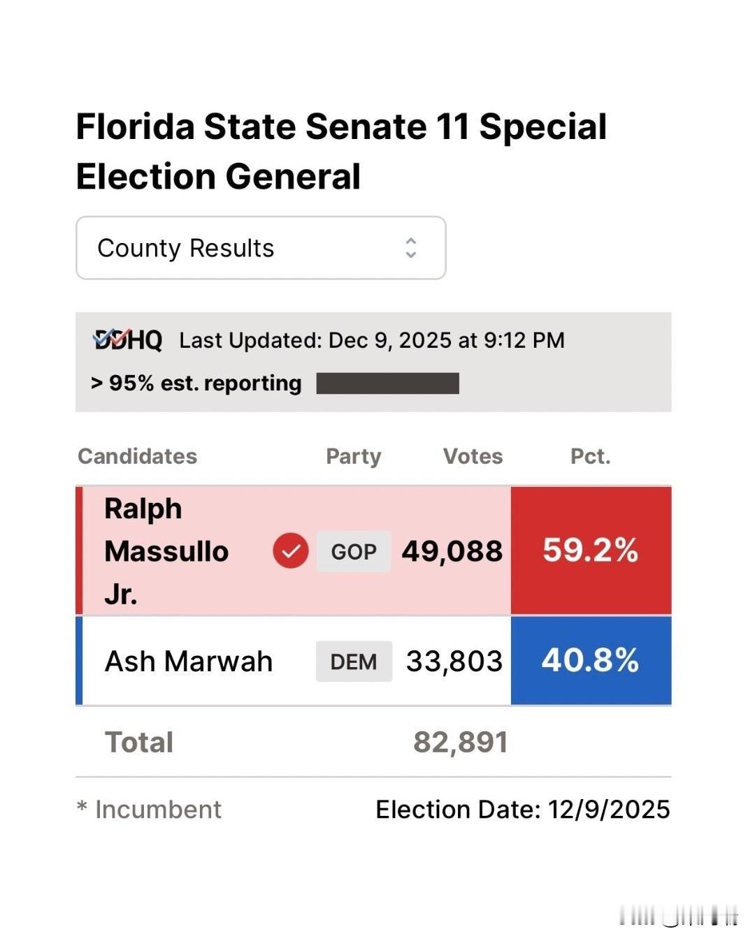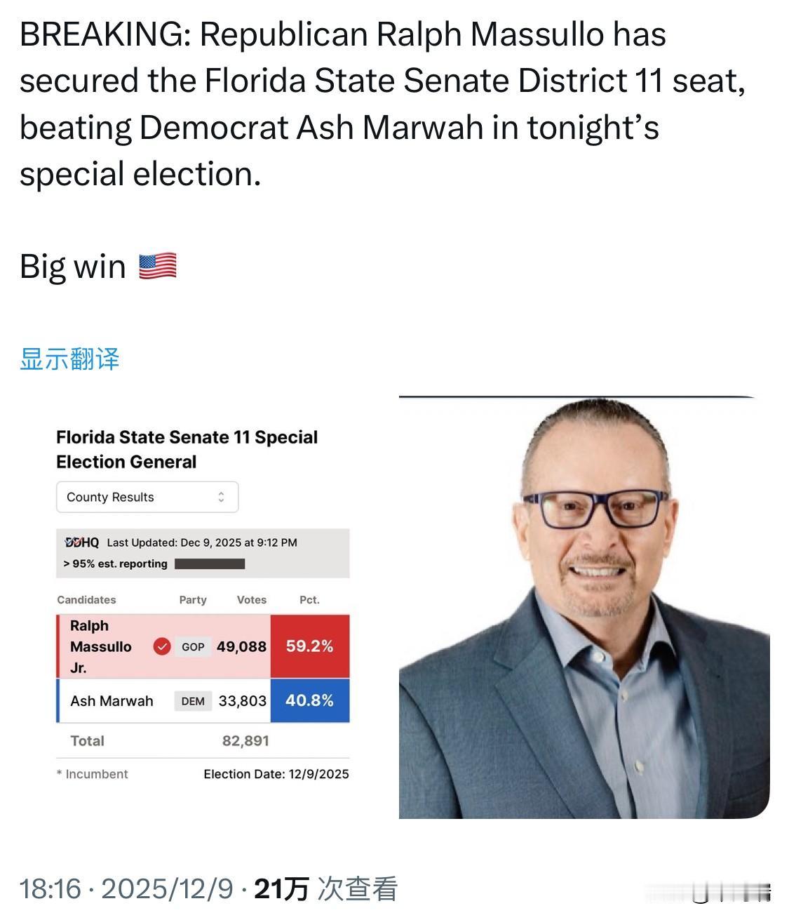 共和党人拉尔夫·马苏洛 (Ralph Massullo) 赢得了佛罗里达州参议院第 11 选区的席位。在 2025 年 12 月 9 日的特别选举中,他击败了民主党人阿什·马瓦 (Ash Marwah)。 选举结果如下: 拉尔夫·马苏洛 Jr. (共和党): 49,088 票 (59.2%) 阿什·马瓦 (民主党): 33,803 票 (40.8%) 总票数: 82,891 该席位是在前任参议员布莱斯·因戈利亚 (Blaise Ingoglia) 被任命为佛罗里达州首席财务官后空缺的。马苏洛是一位来自 Lecanto 的皮肤科医生,他曾在佛罗里达州众议院任职四年。