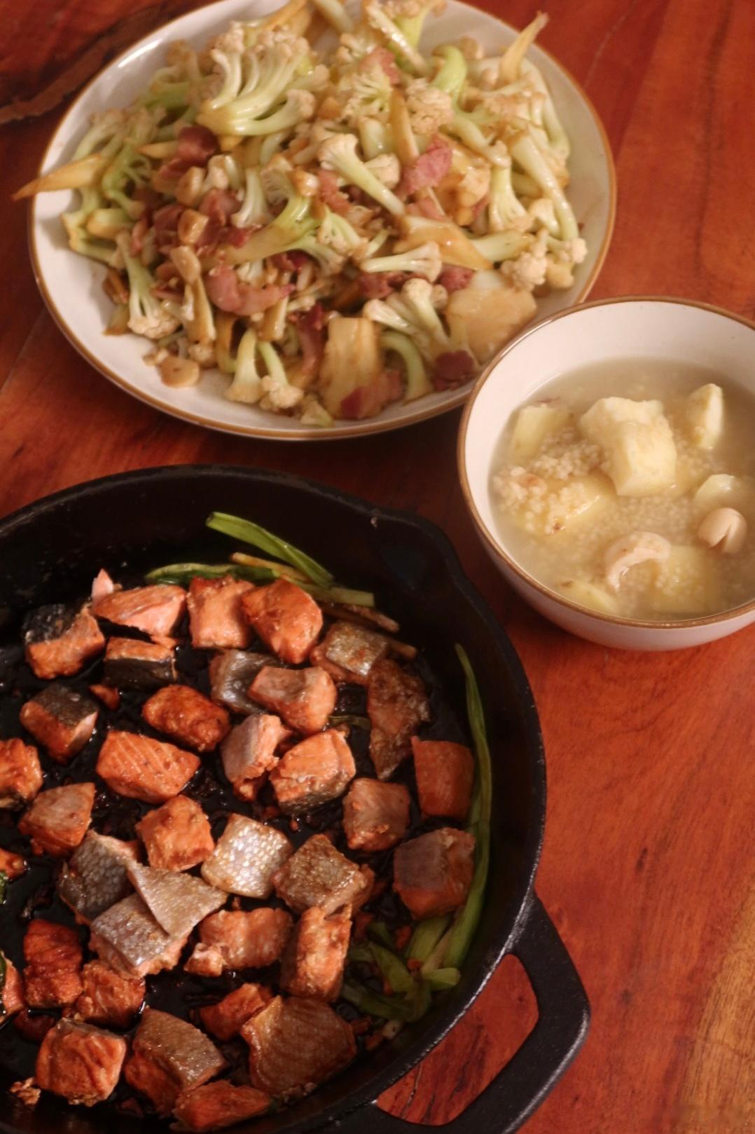 抗炎饮食day106✅葱姜蒜炒一切都好吃早餐:温水冲山药粉午餐:上海青炒口蘑、红薯小米粥、梨水晚餐:照烧野生三文鱼、培根炒花菜、红薯莲子百合小米粥北美做抗炎饮食博主的大多是白人,菜谱很多麻烦看起来也没食欲,好想告诉ta们葱姜蒜炒任何东西都好吃 ,诀窍就是随心大量放