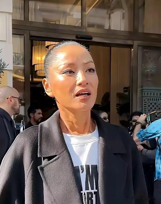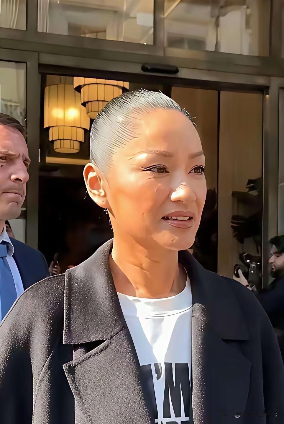 还能认出瞿颍吗? 普通老百姓都在染发或是戴假发掩饰白发的苍老,瞿颍却自然洒脱的把白发向上梳起,扎得又紧,白发根根分明。发际线很高,古铜色的皮肤泛着光。她应该很自信皮肤紧致没皱纹,要不谁有勇气梳这个发型?大家说她剪个光头是不是会更好看呢?