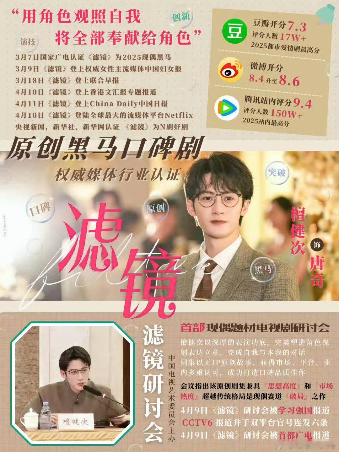 2025年度黑马剧我提名檀健次《滤镜》。原创剧本,现偶评分第一,官媒力挺,研讨会认证,妥妥的原创黑马口碑剧。檀健次天赋打底,叠加努力,已然如此厉害,每一部作品都还在进步,给观众带来的永远都是新鲜感和惊喜感,《滤镜》便是如此。设定新奇有意思,转折搞笑又合理,笑点巧妙又悲伤,节奏勾人又明快,故事新颖又扎实,剧本严谨又奇幻,三观正确又高级,人物鲜活又立体,演技灵动又细腻,颜值好看又耐看,内核雅俗共赏,现偶细糠佳品。而且谁说现偶不需要演技?没演技的人去演,全程面瘫,对观众简直是折磨,唐奇是个很复杂多面的角色,想演好很难,多一分少一分都会不那么恰如其分,但檀健次对角色理解透彻,拿捏的恰到好处。檀健次在表情眼神语言动作上都演绎的淋漓尽致,好真实、好真诚、好自然、好爱业、好敬业,他的演技就像秋衣扎进了秋裤里,暖暖的很安心,正如他所说:“用角色观照自我,将全部奉献给角色。”檀健次滤镜大眼杯表彰小会