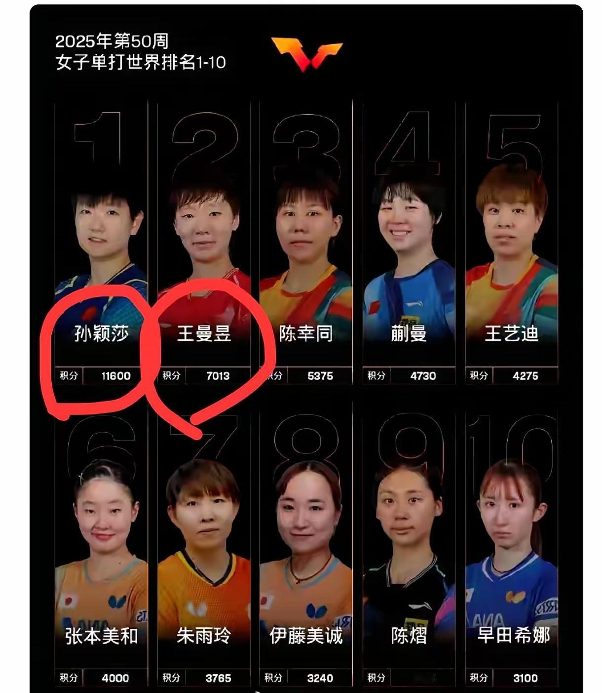 孙颖莎“世界第一”的宝座还能坐多久……? 目前来看,国外选手包括国内选手都没办法对孙颖莎的排名构成实际威胁,因为孙颖莎的个人积分太高了,排名第二的王曼昱才7013分,孙颖莎11600分,11600-7013=4587,4500分得差距,这需要王曼昱拿到几个大满贯赛事的冠军才能超越,前提是孙颖莎不能参加比赛,因为以孙颖莎的能力,只要她参加比赛,肯定就会有积分,而一旦王曼昱比赛失利,她们之间的分差会更大,所以说,在最近3-5年,放眼全球也没有人能够超越孙颖莎,她还会“统治”女乒3-5年时间! 孙颖莎排名“世界第一”已经178周了,之前排名时间最长的是张怡宁的137周,孙颖莎这“恐怖”的排名到底是怎么来的呢?说到底还就是参加比赛多,而且是特别多,这几年几乎没有缺席过任何赛事,不管是世界杯,世乒赛还是奥运会,又或者是全运会,还有各种商业赛事,孙颖莎基本上一概不拒,比赛多再加上实力强,积分自然就多,这是其她球员没办法做到的,更别说超越了! 目前孙颖莎的大满贯就差奥运会女单金牌了,2028年洛杉矶奥运会可能也是她最后的机会,届时28岁的她正处于运动员的黄金年龄,无论是心态,技术还是经历都会达到巅峰状态,我们有理由相信她会完成自己的大满贯梦想,而她的“世界第一”的记录保持,真的不知道会持续到什么时候,或许会到2028年以后吧……!孙颖莎