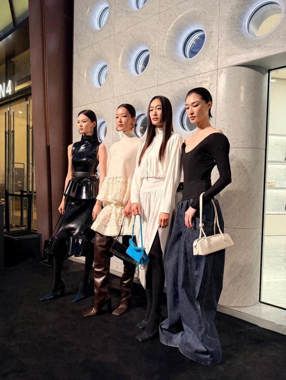 4位超模同框:白色裙装、棕色长靴,搭配金色耳环的杜鹃气场强大;一袭黑色衣裙,拎着黑包,风姿绰约美女的是贺聪吧? 居然还看到了陈冠希的老婆秦舒培,1米79的她长发垂胸,白裙黑袜,目光低垂,男相明显,你看是吗?那位微闭双眸的超模是谁?