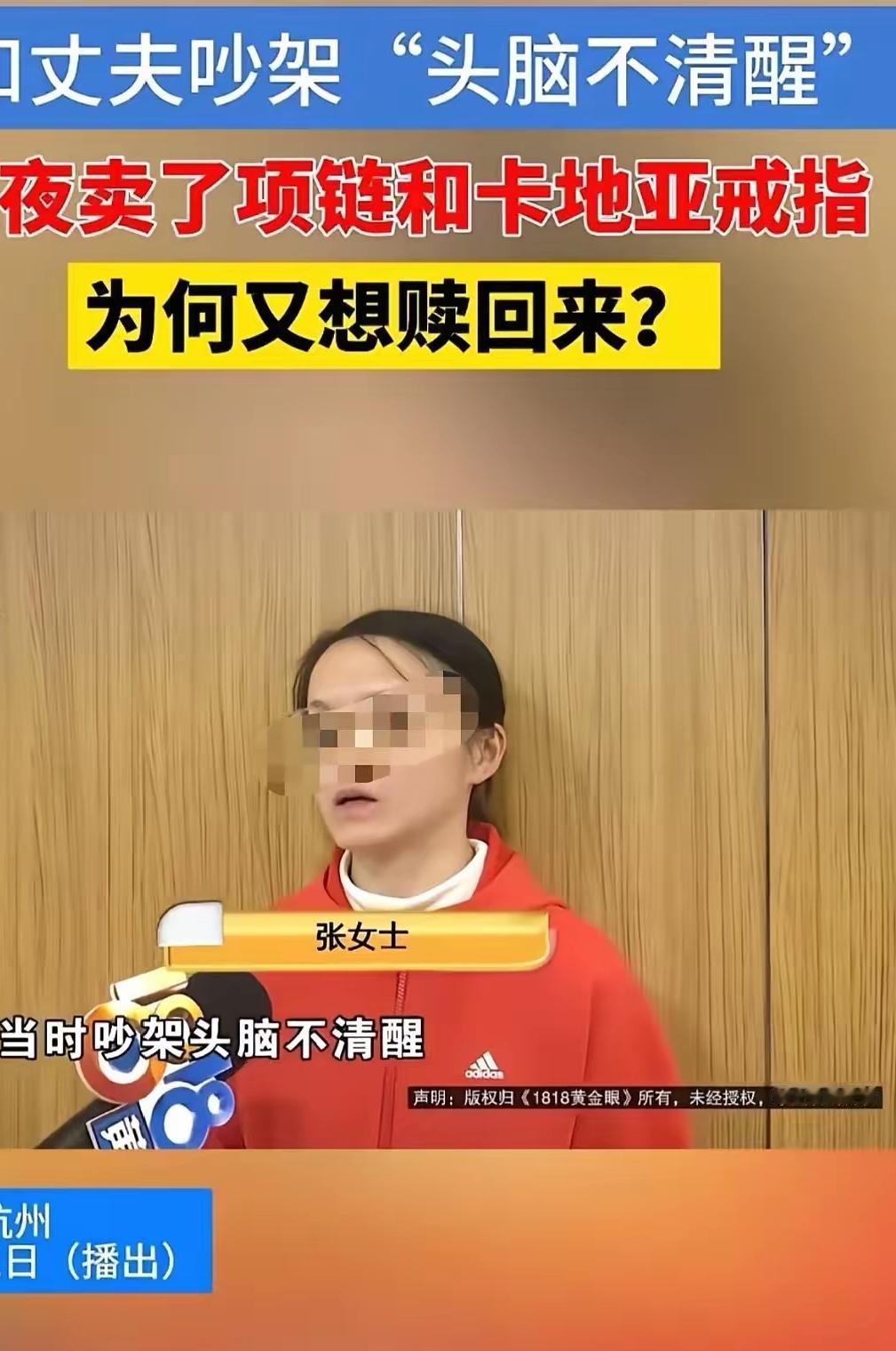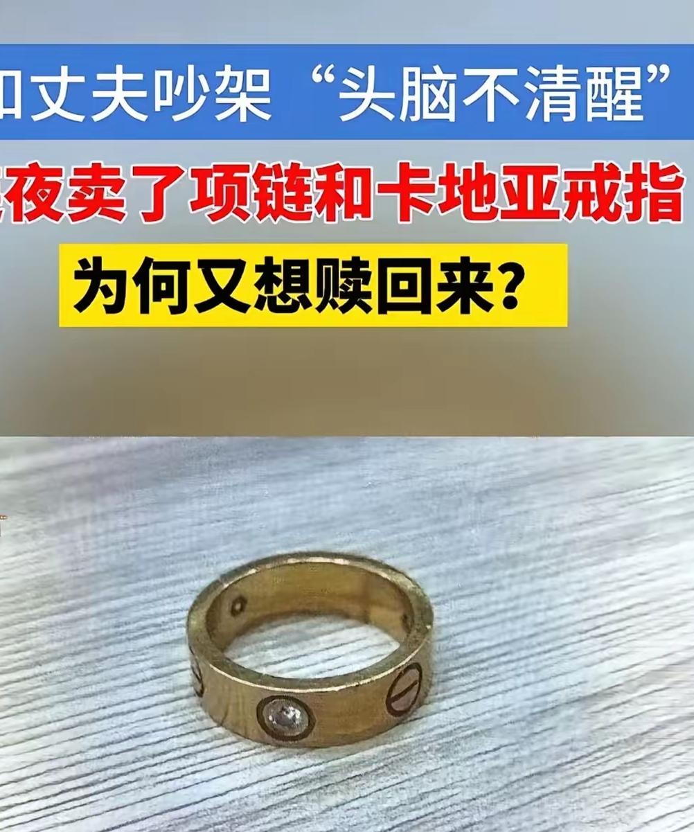 杭州的张女士前几天跟老公拌了几句嘴 一冲动就把老公以前送她的卡地亚戒指和铂金项链拿到当铺,直接卖了5000块, 等第二天情绪平复了,她才发现那戒指现在至少得值5000块,项链更是远超1000块,心里就后悔了,想按原价把东西赎回来, 可当铺那边却说要加1500块手续费才能赎。 后来调解员上门了,店家看到有人来,直接就拒绝采访,还说让网友们给评评理。这事儿一出来,网上就吵翻了天:有人觉得张女士情绪太冲动,做事没分寸,既然卖了就该认;也有人说店家给的价太低,就是趁人之危。 我觉得啊,冲动真是魔鬼,一点不假!两口子吵架的时候,拿对方送的贵重东西撒气,最后往往是自己吃了亏。就说那枚戒指吧,还是定制款,七八年前买的时候就一万多了,现在5000块就卖了,想想都得肠子都悔青了吧? 成年人就得为自己的决定负责,东西都卖了,哪有再原价赎回来的说法?店家做生意也得赚钱啊,房租、人工哪样不要钱?不过这1500块手续费确实有点高,要是双方都让一步,说不定就能解决矛盾了。 这事儿也给咱们所有人提了个醒:吵架的时候啊,真别做什么重要的决定!你们觉得张女士最后会怎么选?要不要付这1500块手续费把东西赎回来呢? -search.byteimg.com/img/labis/29f3e740087e9ddc04655548ab2e8fba~480x480.JPEG