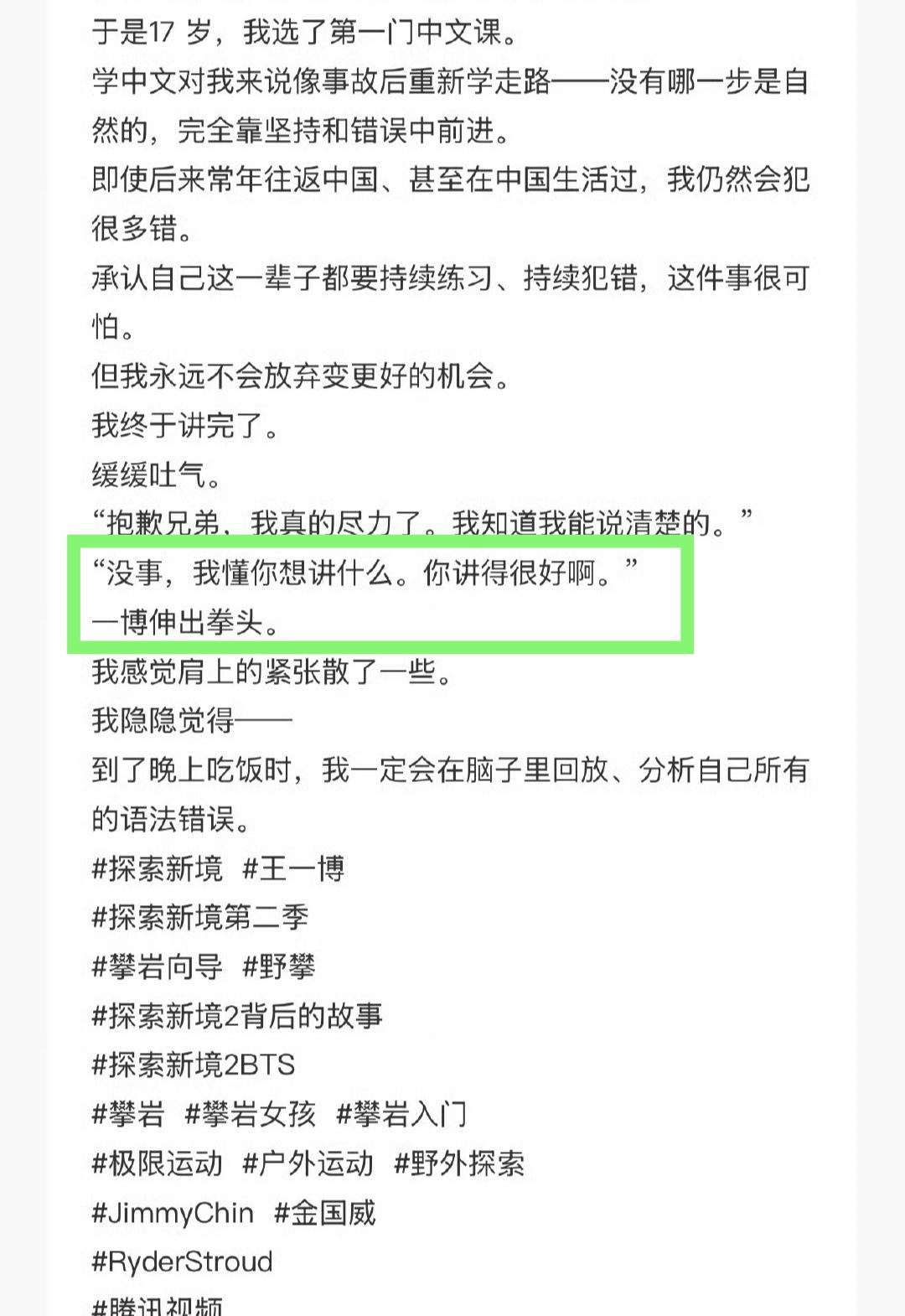 《探索新境2》王一博的攀岩“搭档”史瑞德又分享更新了和王一博的幕后花絮。 史瑞德自述中文表达不好,会很着急—— 【我终于讲完了。缓缓吐气,努力让肩膀放松。 “抱歉兄弟,我真的尽力了。我知道我能说清楚的。”我有点不好意思地笑着。 “没事,我懂你想讲什么。你讲得很好啊。”一博伸出拳头。 我也伸出去碰拳,感觉肩上的紧张散了一些。】 王一博说自己“我觉得我是没有办法给别人情绪价值的人”,但是在和瑞德相处的过程中,王一博会情绪特别稳定特别冷静特别有耐心的等他说完,再鼓励“没事,我懂你想讲什么,你讲的很好啊”,这难道不是在提供极好的极其及时的情绪价值吗? 这样情绪稳定,能够包容和理解,又能够共同面对和解决困难的朋友,谁不想要? 王一博 王一博探索新境2