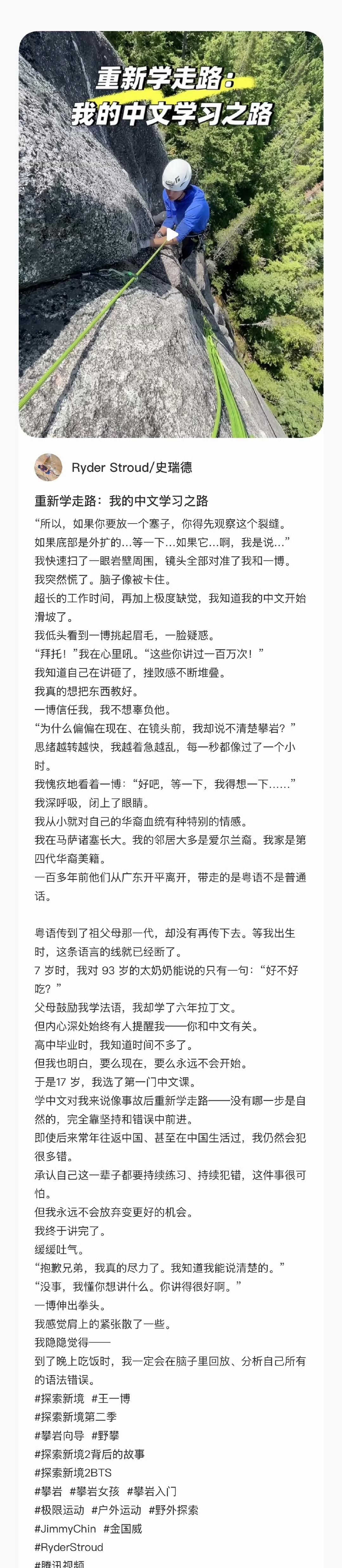 《探索新境2》王一博的攀岩“搭档”史瑞德又分享更新了和王一博的幕后花絮。 史瑞德