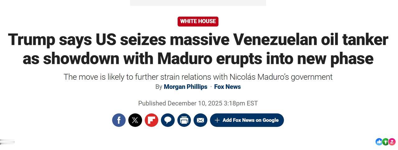 美国扣押委内瑞拉一艘大型油轮 当地时间周三,特朗普宣布美国扣押了一艘委内瑞拉油轮,标志着双方紧张局势的急剧升级。 特朗普在白宫说:“我们刚刚在委内瑞拉海岸扣押了一艘油轮。大型油轮,非常大。有史以来最大的一次行动。而且,还有其他事情正在发生。所以你以后会看到这些。你以后会和其他一些人谈论这件事,它被扣押是有充分理由的。” 委内瑞拉石油行业一直面临美国制裁。最近,委内瑞拉周边地区经历了数十年来最大规模的美军部署,包括杰拉尔德·R·福特号航母的驻扎,以及10架F-35战机部署至波多黎各。特朗普还一直威胁要对其采取地面军事行动。