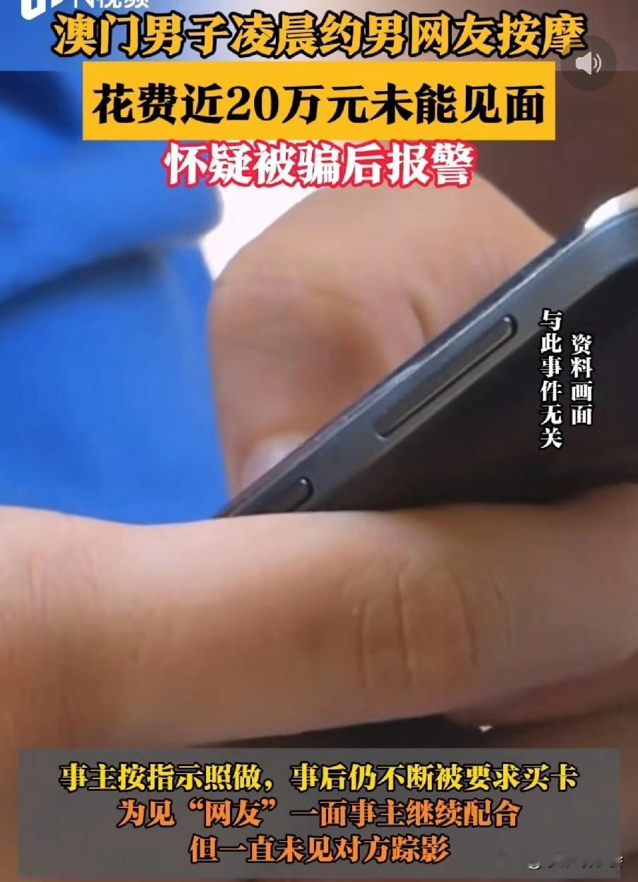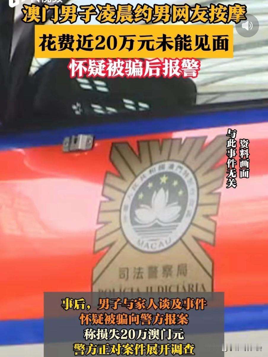 近日,澳门男子凌晨想找一个男网友过来按摩,没想到花费了20万都没能把人请来,意识到被骗后,男子果断报警。 大千世界,无所不有!男子被骗还是有原因的,想找人按摩,好多正规平台都有,不知道这男子在哪找的这个被骗的软件。估计是想另有所图,所以才被骗的! 连人影都没见,都敢给人家转20万,被骗还是有原因的。澳门男士spa 澳门水疗 澳门男技师 澳门男士 澳门男 澳门男人 澳门足浴
