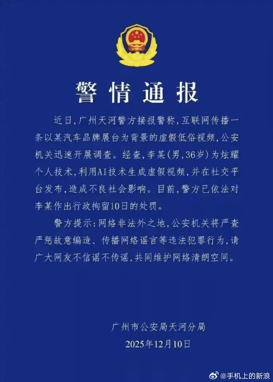 李某用AI生成车展虚假低俗视频被拘【网警打谣记 | 用AI生成“车展虚假低俗视频”,李某被行拘10日】网警查处AI生成虚假低俗视频案近日,有不法分子利用AI工具伪造了一条以某汽车品牌展台为背景的虚假低俗视频,并在互联网平台传播,严重污染网络空间、扰乱社会秩序。公安机关迅速开展核查、调查、取证等工作,并确认李某(男,36岁)为视频制作者。公安机关迅速抓获涉案违法嫌疑人李某,李某对其制作、发布并传播虚假低俗视频的违法行为供认不讳。经查,李某为炫耀个人技术,利用某AI工具生成了虚假低俗视频,并在社交平台发布,引发大量传播,造成不良社会影响。目前,警方已依法对李某作出行政拘留10日的处罚。(公安部网安局)